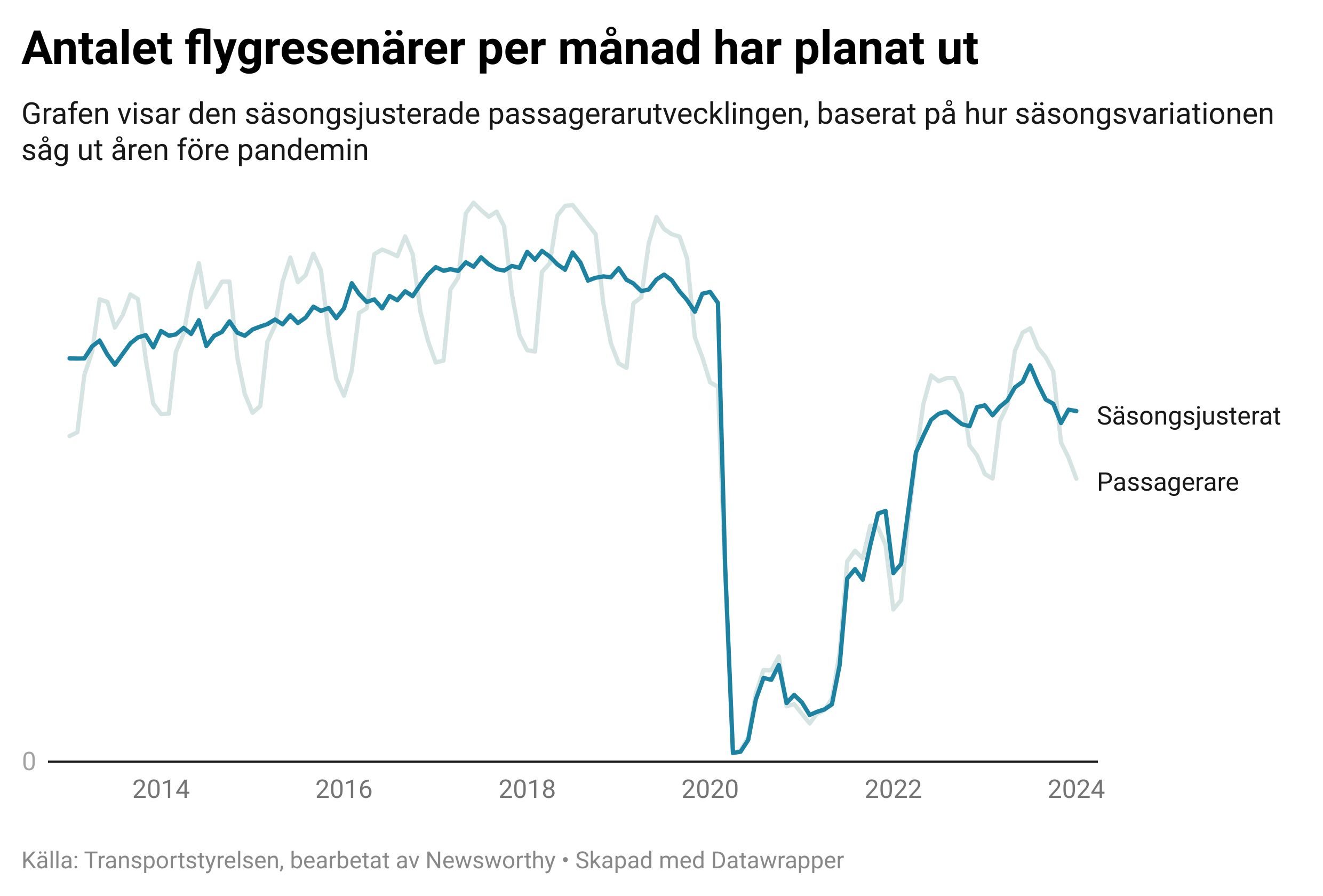 Svenskarnas flygande tycks ha nått en topp redan före pandemin, omkring 2017/2018. När pandemin slog till fanns alltså en begynnande nedåtgående trend.