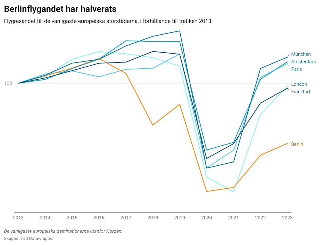 Flygtrafiken till från svenska flygplatser till Berlin föll redan efter flygbolaget Air Berlins konkurs 2017, men den stora skillnaden syns i återhämtningen efter pandemin. Där ligger Berlintrafiken långt ifrån övriga europeiska storstäder.
