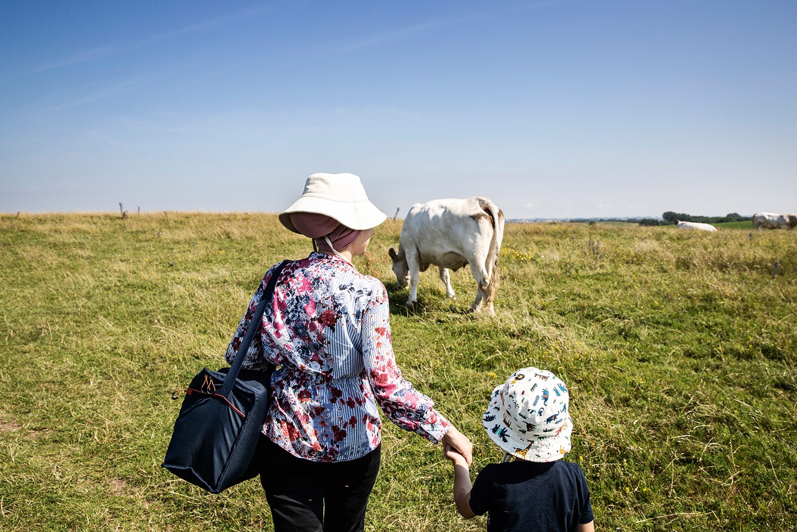 Mahas sexåriga son Nadeem har letat nyckelpigor men nu börjar han bli rastlös och drar i mammas solhatt. Efter ett fotbad i bränningarna fortsätter vandringen uppför klintkanten.