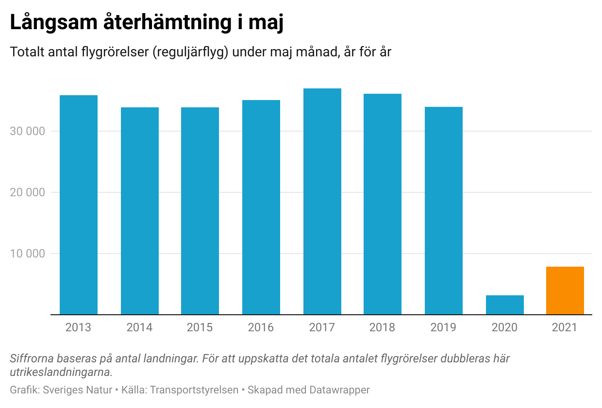 I maj gick omkring 7 800 passagerarflyg (reguljär och charter) till och från svenska flygplatser, och dessutom knappt 500 taxiflyg. Det är drygt dubbelt så många flygningar som i maj 2020, och en viss ökning jämfört med april, men fortfarande inte i närheten av nivåerna före pandemin. Om de senaste årens flygtrender stått sig, hade vi kunnat vänta oss mer än fyra gånger så höga siffror.