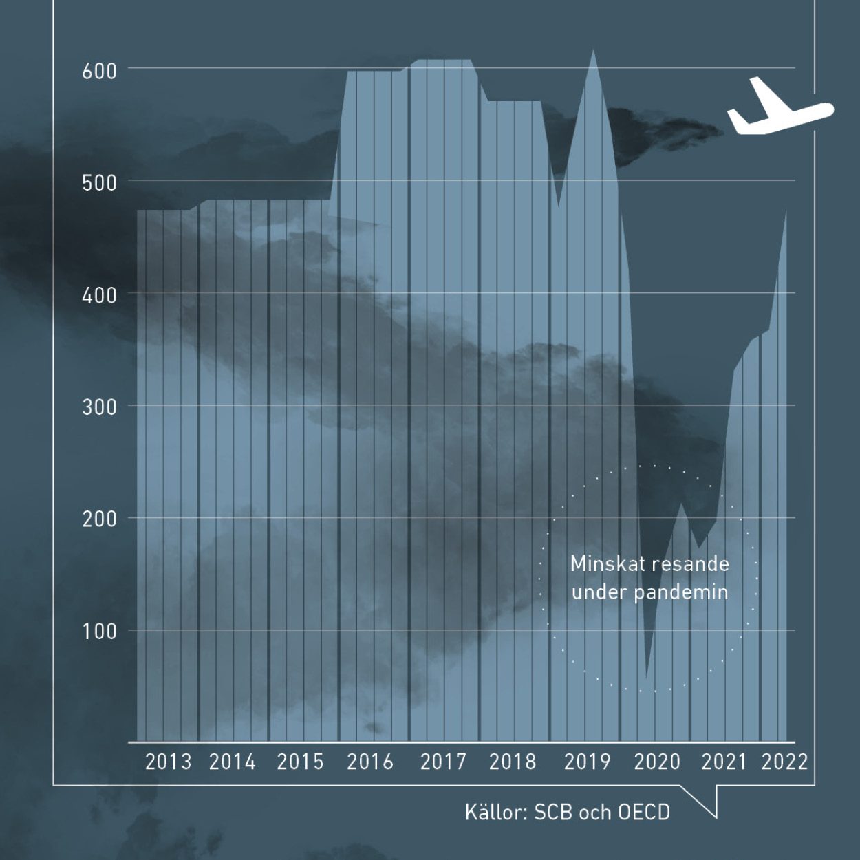 Kommersiell flygtrafik till och från Sverige, samt inrikes. Angivet i tusen ton koldioxidekvivalenter. 2013–2018 är beräknade utifrån ett genomsnittligt värde på grund av begränsad statistik.