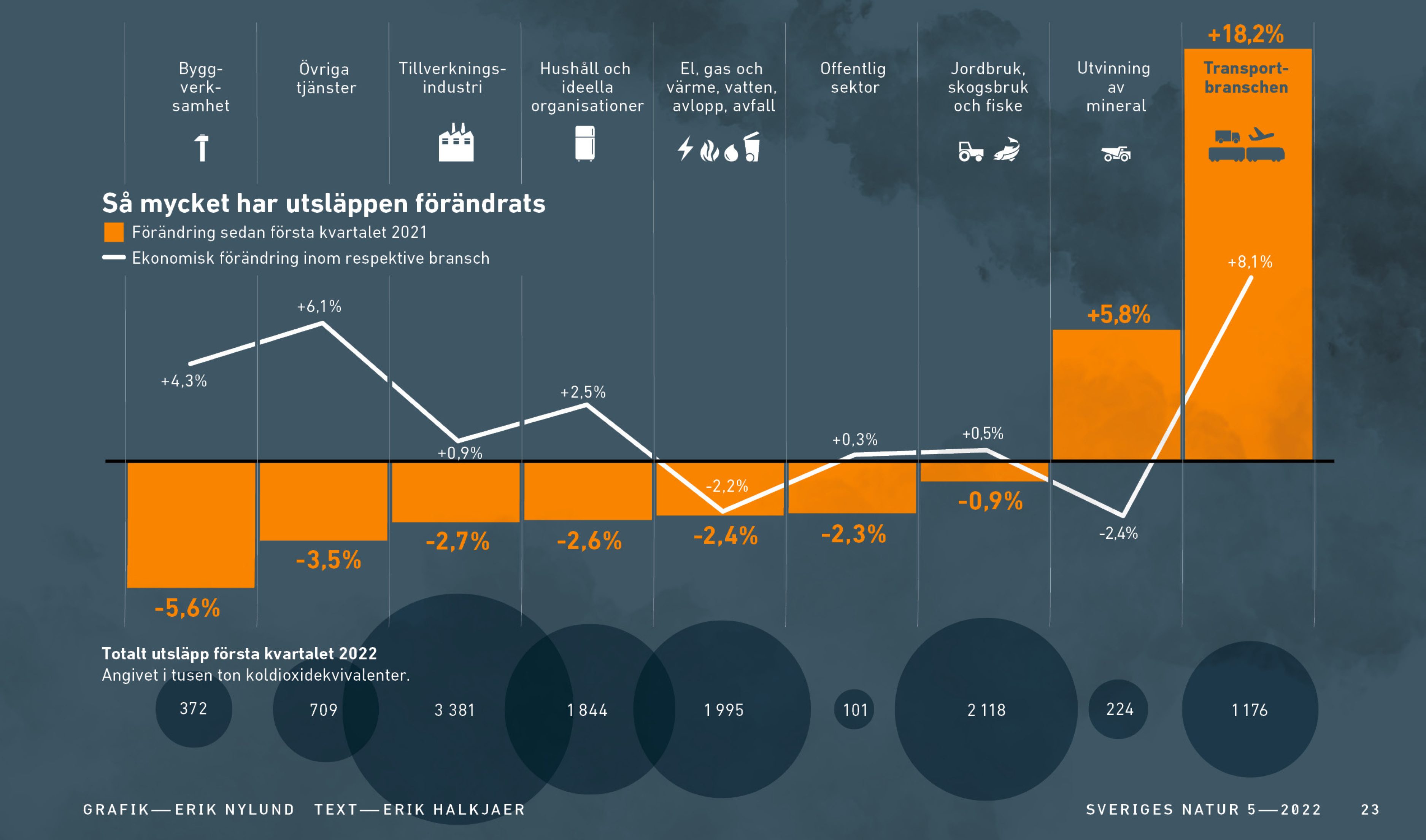Transportbranschen är också en sektor som ekonomiskt återigen visar tillväxt, medan utvinningen av mineral visar negativa siffror trots ökande utsläpp. Den sektor som står för störst utsläpp totalt sett fortsätter att vara industrin, följd av jordbruks-, skogsbruks- och fiskesektorn.