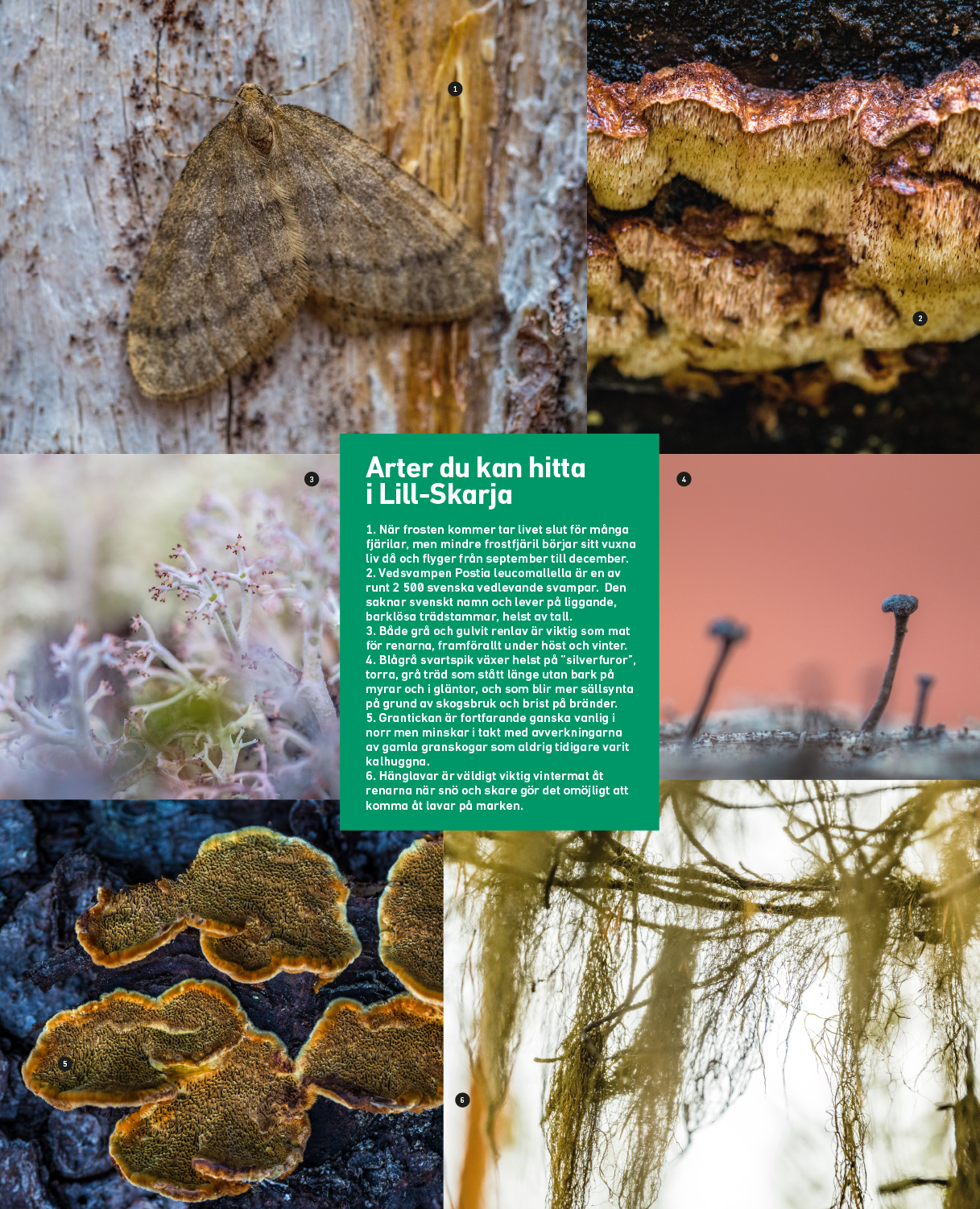 Arter i Lill-Skarja: 1. Mindre frostfjäril, 2. Vedsvampen Postia leucomallella, 3. Grå och gulvit renlav, 4. Blågrå svartspik, 5. Granticka, 6. Hänglavar. Klicka för större bild.