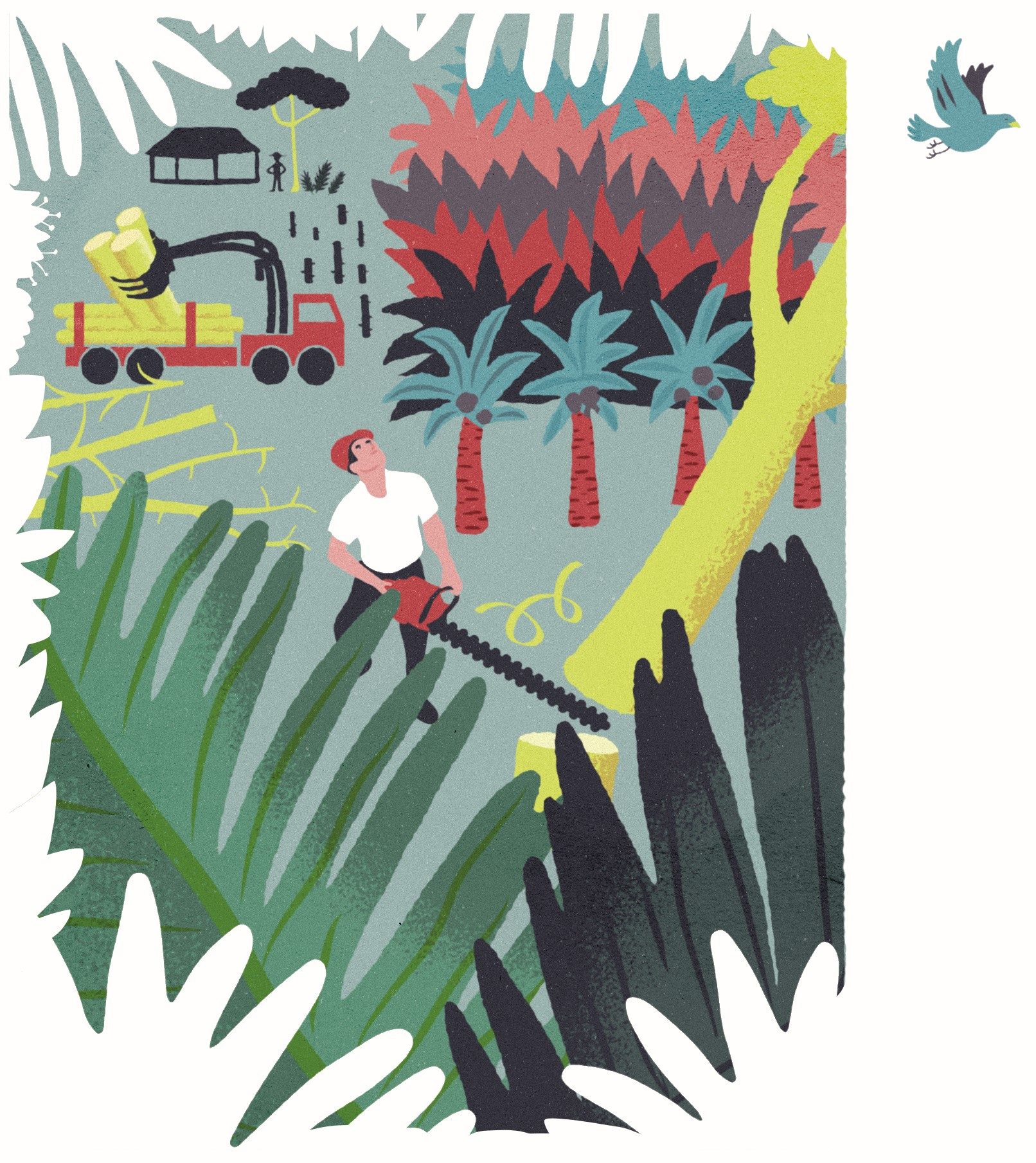 Regnskog skövlas för att bereda plats för palmoljeplantager. Det leder bland annat till höga koldioxidutsläpp, att jordbruksmark försvinner, att djur och lokalbefolkning fördrivs och att den biologiska mångfalden utarmas.