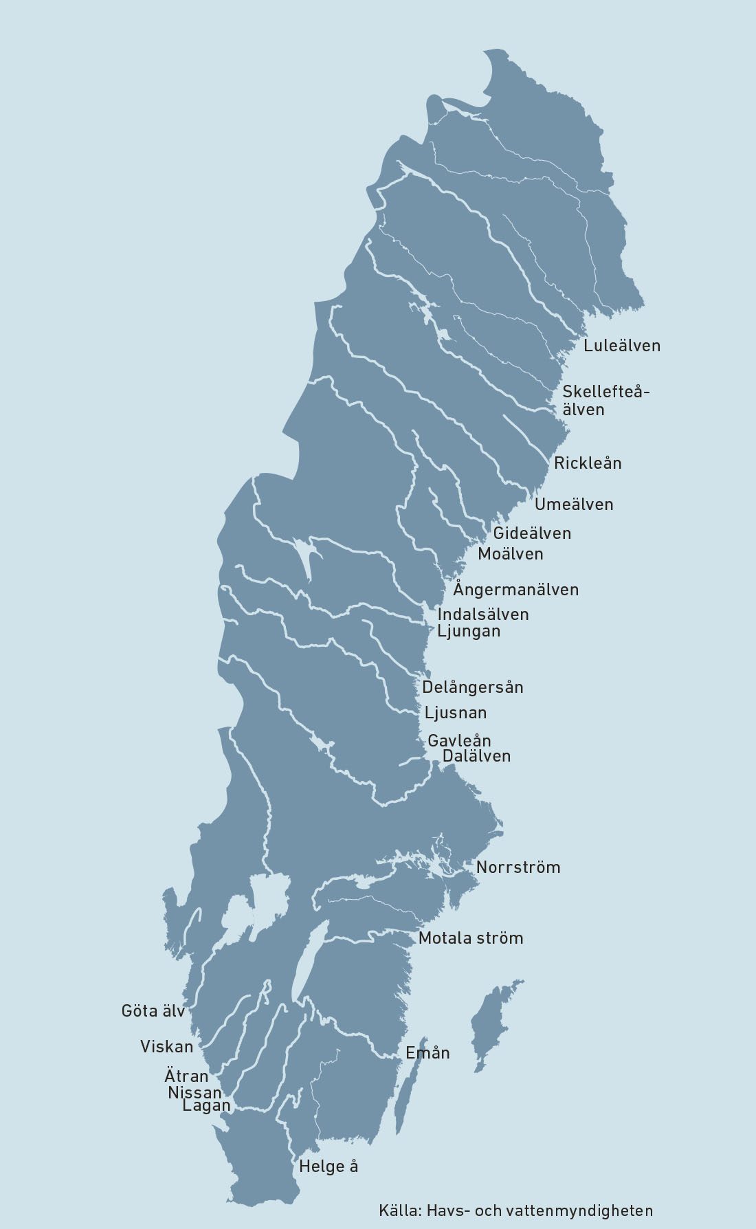 Här är de 22 vattendrag där produktionsförlusten av energi beräknas bli som störst på grund av de nya miljömålen. På kartan syns även Örekilsälven som påverkas mindre och inte är utskriven med namn. Örekilsälven rinner från Dalsland ut i Gullmarsfjorden på västkusten. Klicka på bilden för att se den större.