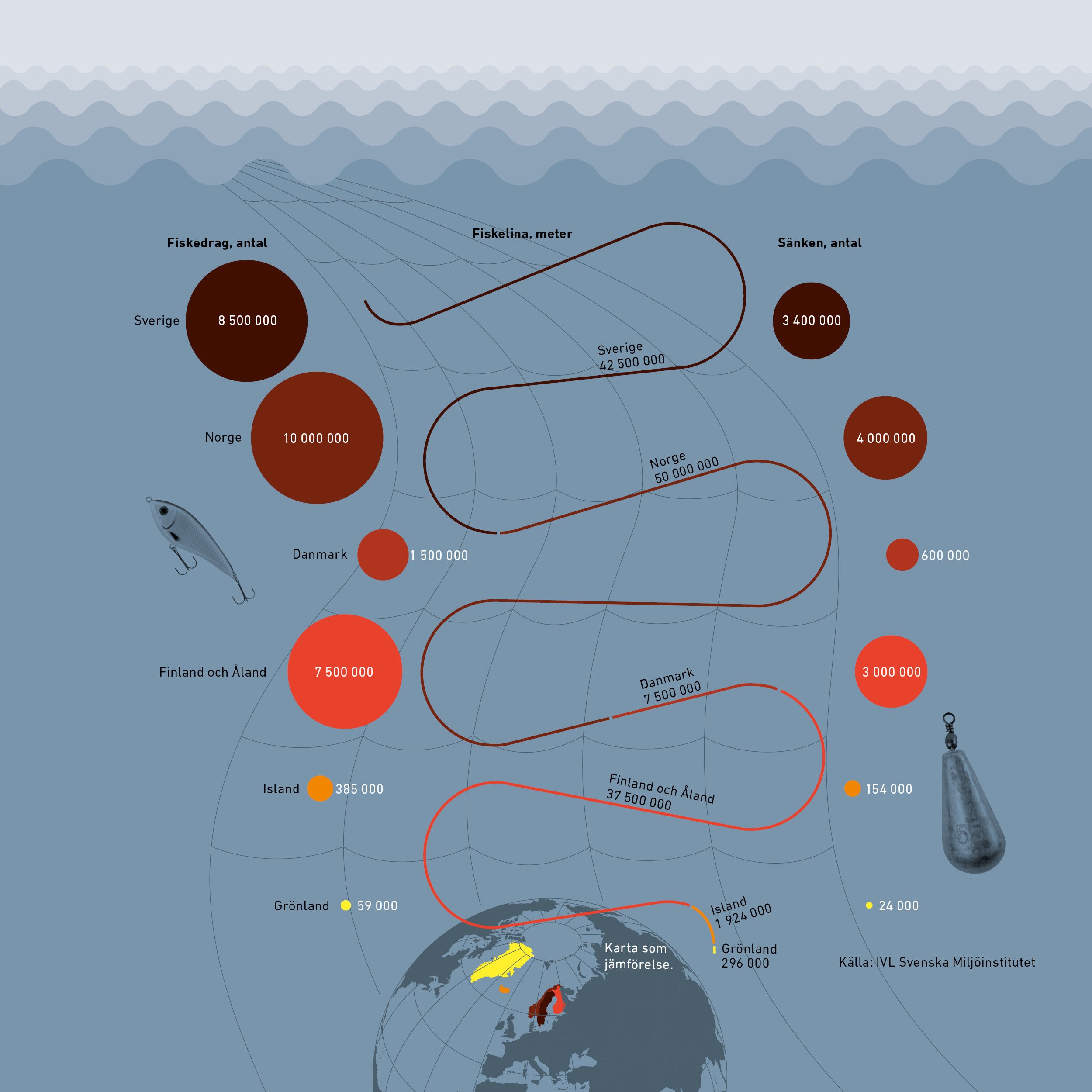 Varje år försvinner stora mängder fiskeredskap, fiskelinor och fiskenät vid de nordiska ländernas kuster, sjöar och vattendrag. De utgör en fara för fiskar och andra organismer, liksom för vattenmiljön med utsläpp av kemikalier och mikro- och makroplaster. Siffrorna är en uppskattning av förluster per år.