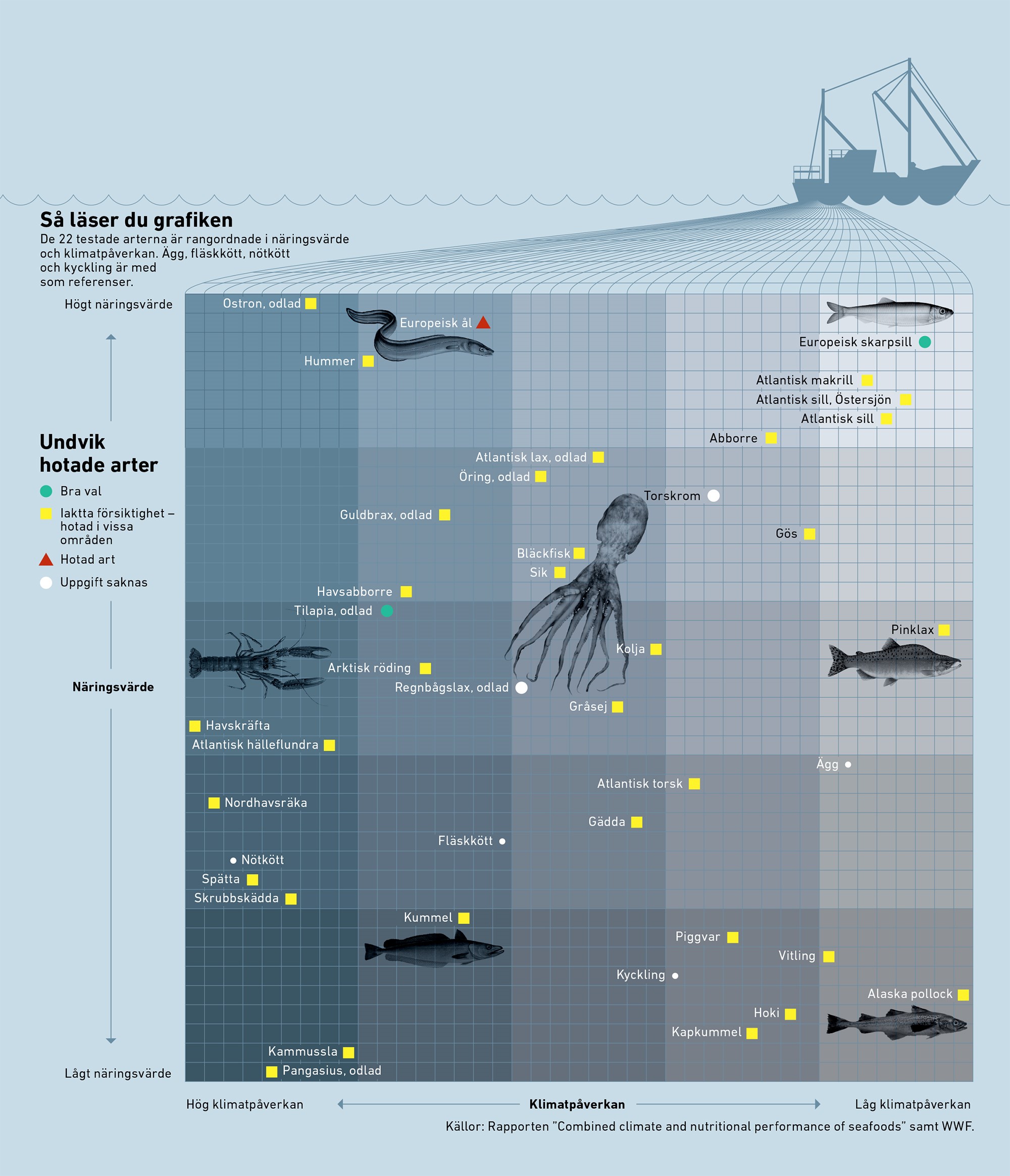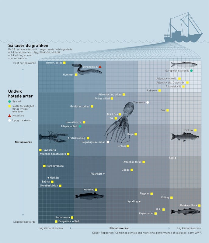 I ny forskning från Rise, Research Institutes of Sweden, vägs de två faktorerna samman. Längst upp till höger finns de fiskar och den sjömat som rankas högst i båda parametrarna. Skarpsillen, som äts som sardiner och ansjovis, är med andra ord underskattad.