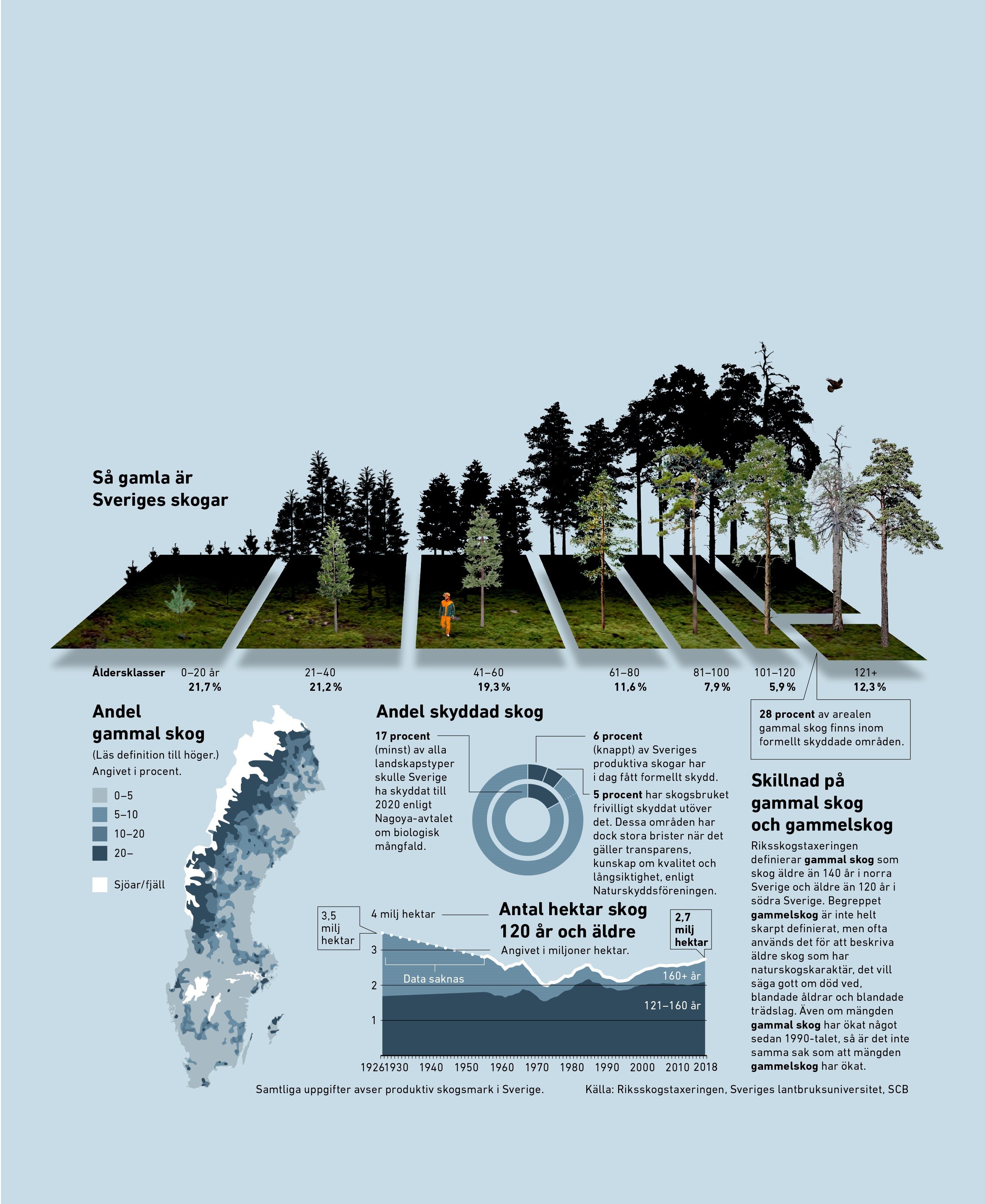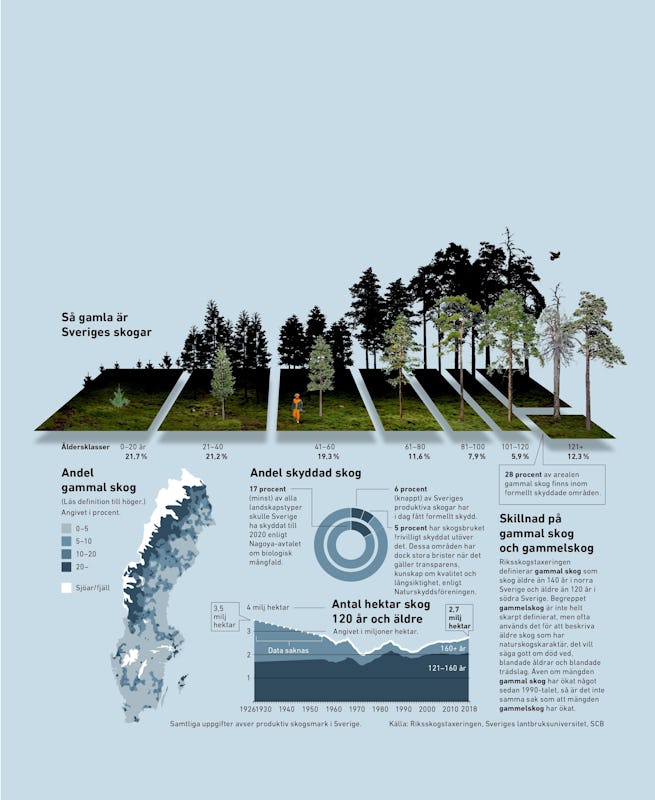 Bara en dryg tiondel av Sveriges skogar är över 120 år, och den största delen av de äldre skogarna finns närmast fjällen. Över 60 procent av skogsmarken är hyggen och ungskogar yngre än 60 år. Så unga skogar är sällan särskilt intressanta, vare sig för skogsvandrare eller hotade arter.