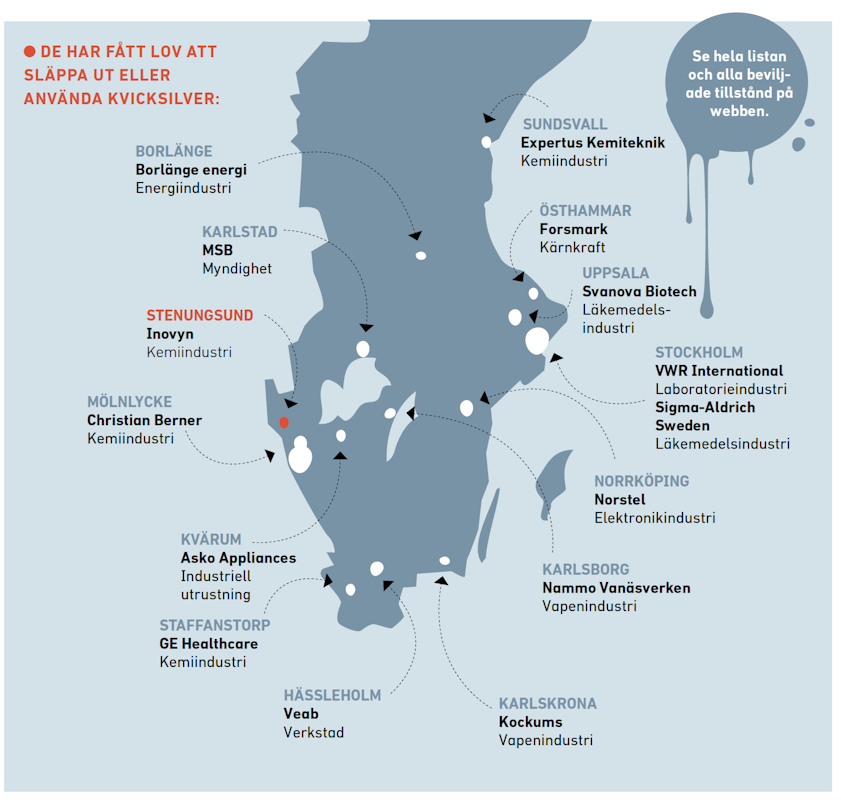 Dispensen till Inovyn i Stenungsund är också kontroversiell eftersom det kan misstänkas att företagets kvicksilveranvändning har bidragit till att förhöja kvicksilverhalterna i vattnen utanför fabriken. Sedan 2009 har Inovyn släppt ut 125 kilo kvicksilver i luften och ytterligare nästan fyra kilo i vattnet. Om inte företaget hade fått så många undantag och dispenser hade den miljöfarliga produktionen troligen inte kunnat fortsätta efter 2010.