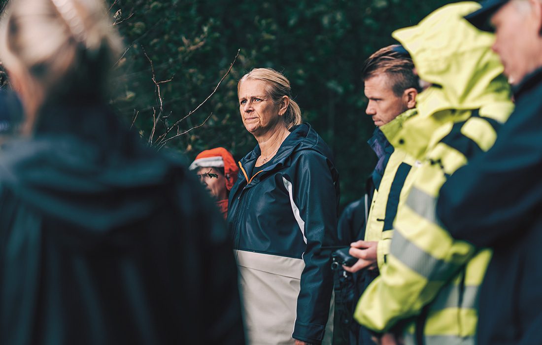 Många i sällskapet sänker garden en smula, knäpper upp jackan och faller ur de roller de hållit så strikt på inne i rättssalen. Det är svårare att vara upprörd i gummistövlar.
