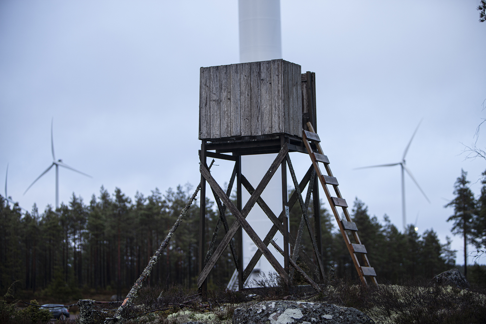 När jag kliver ur bilen blir susandet påtagligt. Likt ett jetflygplan som taxar några hundra meter bort, markerat av ett rytmiskt svischande. Ett jakttorn står intill och jag undrar om någon använder det nu för tiden. Färsk spillning visar att det finns älg. På väg ut ur området ser jag ett hus, så jag går för att se om någon bor där. Det ryker från en lövhög. En knapp kilometer där bakom, delvis dolt av höga granar, står tre kraftverk och snurrar. Ljudet är detsamma som uppe på höjden, om än mindre intensivt. En man möter mig på infarten. Han förklarar att han inte vill ställa upp med namn eller bild, men går med på en liten pratstund.