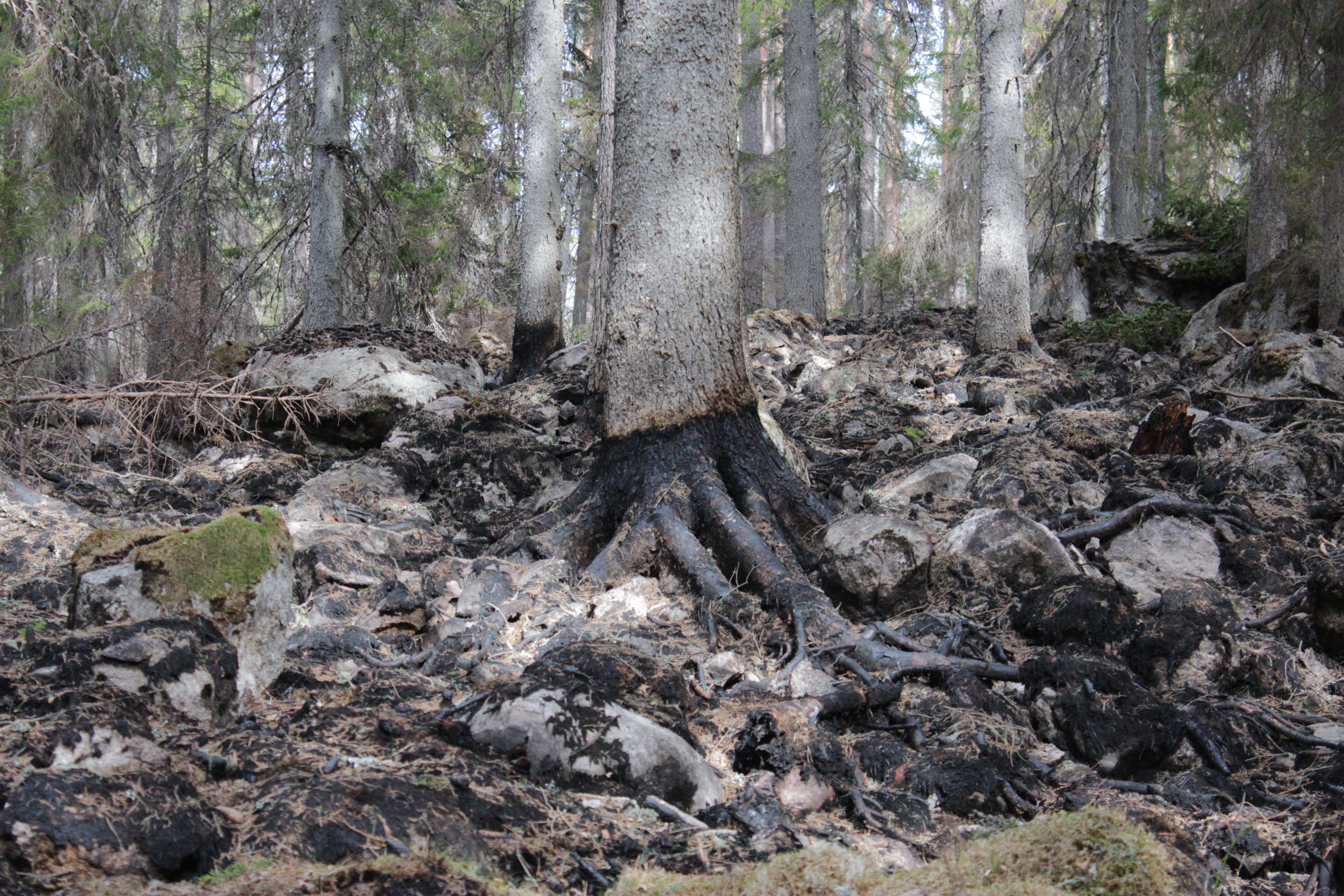 Allt är svart, stammar, grenar, kvistar, Inget liv ens i trädtopparna. Vi vandrar runt på det stora brandfältet och förundras över eldens kraft. Stenarna på marken har spruckit i hettan och ligger bara. Ris, mossa, förna och humus har brunnit upp. Här har en verklig eldstorm dragit fram, så intensiv att brandsprutornas motorer tidvis stannade av syrebrist.
