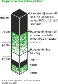 - De senaste två årtiondena har havsnivåerna stigit med tre millimeter per år. Till 2100 förutspår FN att havsnivån kom-mer att vara mellan 28 och 98 centimeter högre än i dag, beroende på olika scenarier. Det förutsätter att koldioxidut-släppen elimineras till år 2070.