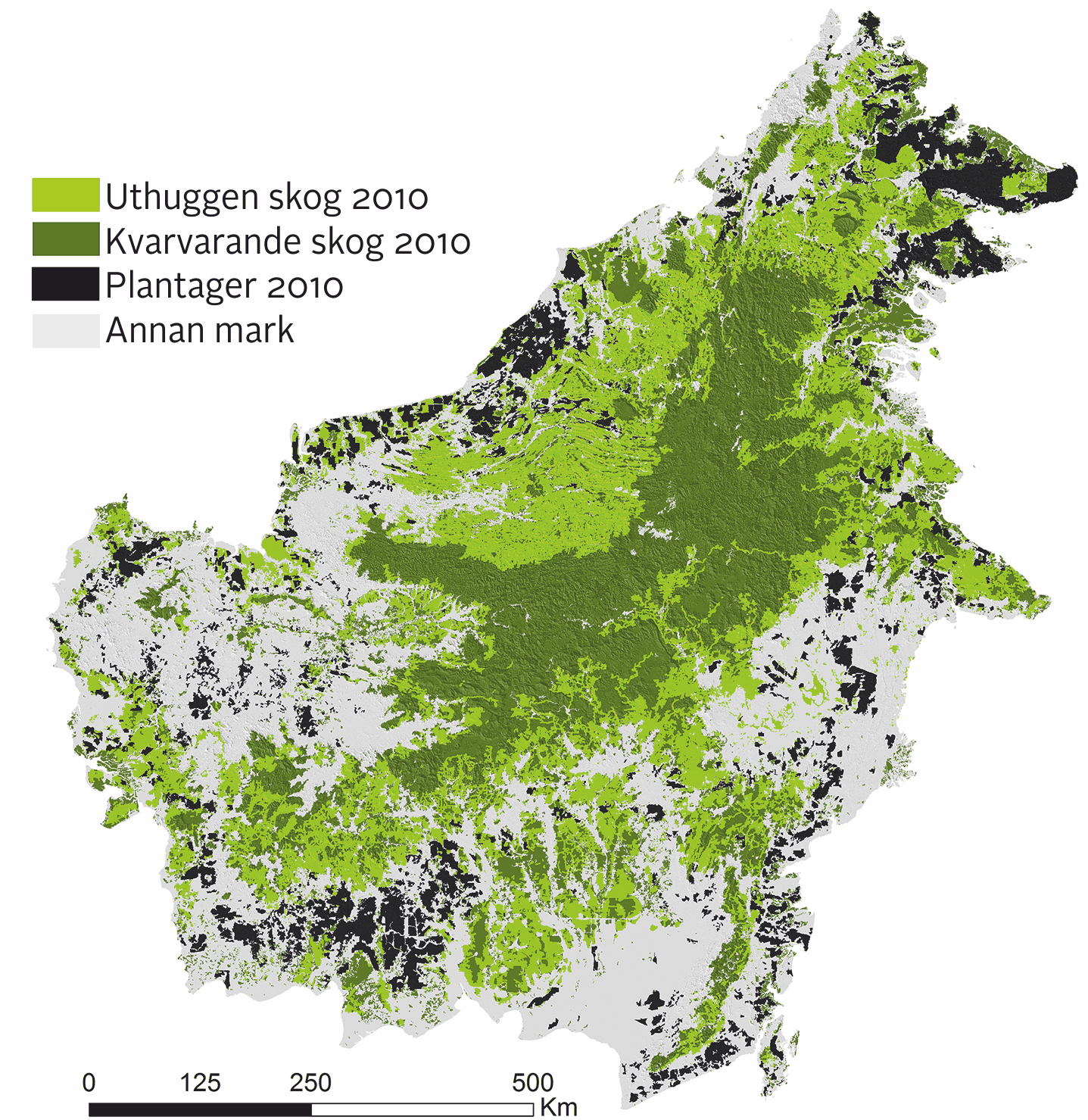 Ytterligare en tredjedel av Borneos skogar är uthuggna. De värdefulla trädslagen har avverkats, kvar blir sly och trasiga skogsrester. Den biologiska mångfalden i skogen minskar kraftigt redan vid små ingrepp i det känsliga ekosystemet. Ungefär tio procent av landytan täcks i dag av stor-skaliga plantager av oljepalmer eller snabbväxande trädslag för produktion av pappersmassa.