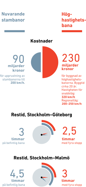 ÄR HÖGHASTIGHETSBANOR för snabbtåg det bästa för Sverige eller är det bättre att rusta upp befintliga stambanor? Höga kostnader, små tidsvinster och få resenärer gör sannolikt höghastighetsbanorna samhällsekonomiskt olön-samma. Klimatvinsterna bedöms som små och utsläppen från själva bygget väntas bli stora. Men de orter som får stationer skulle troligen få ett uppsving. De nya spåren skulle också avlasta de i dag svårt ansträngda stambanorna. Om befintliga banor byggs om så att de klarar högre hastigheter väntas trängseln på spåren fortsätta in i framtiden.