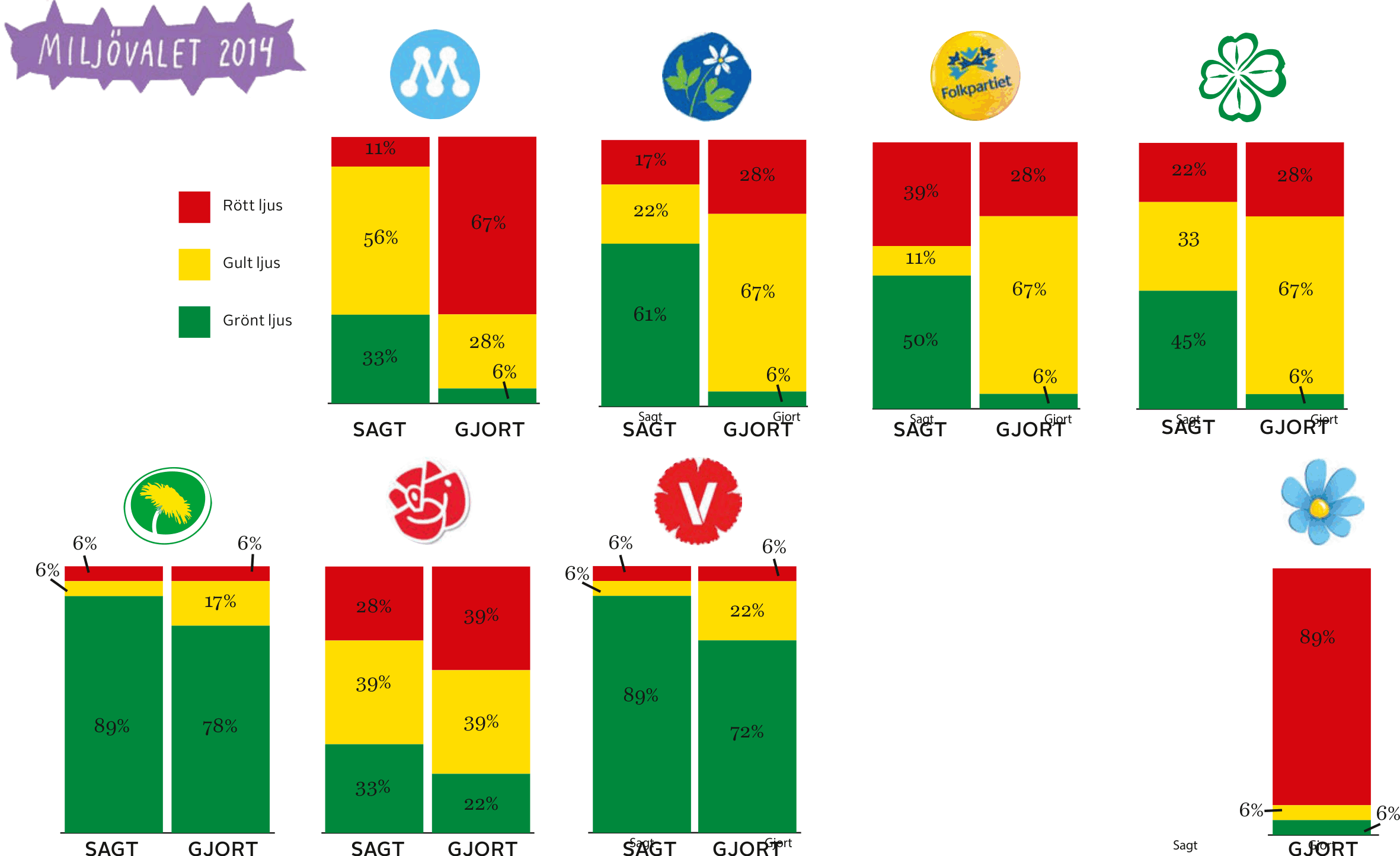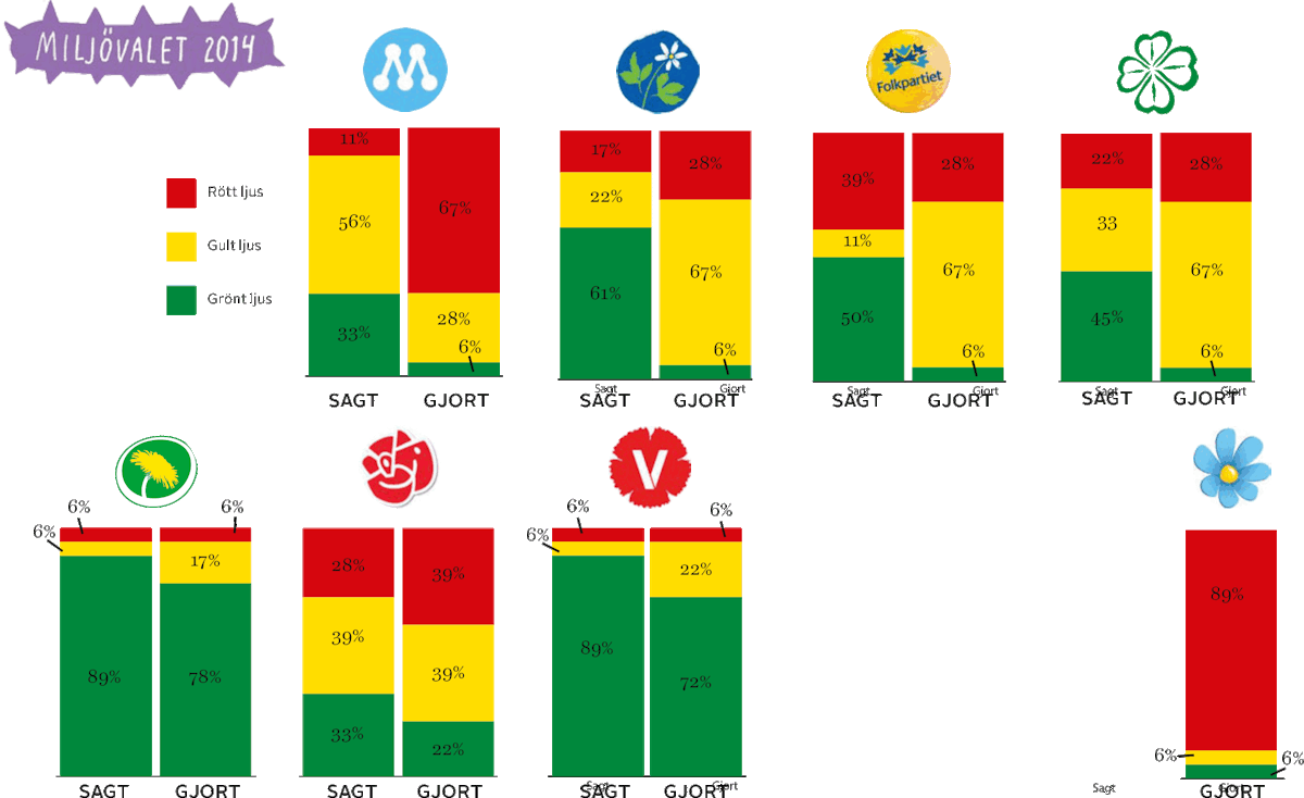 Diagrammen visar, i procent, i vilken utsträckning partierna sagt ja till Naturskyddsföreningens krav i valenkäten 2010 och vilken utsträckning de gjort något för att uppfylla dessa vallöften. Totalt granskades 18 frågor.