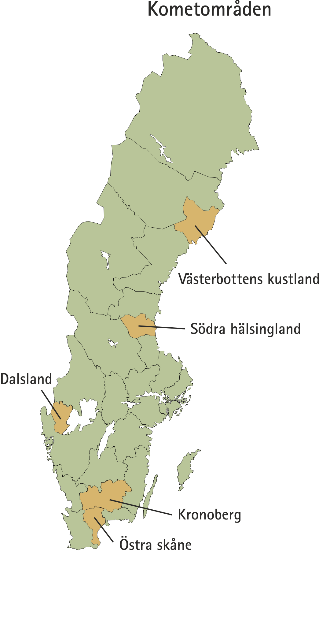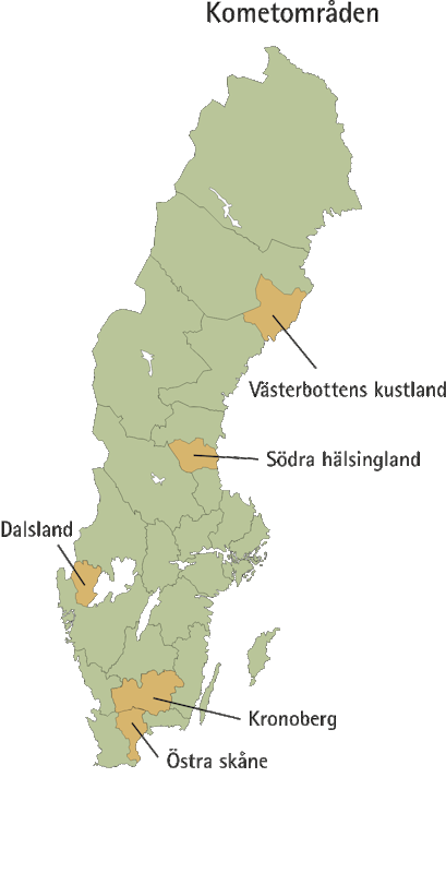 1 Västerbottens kustland 2 Södra Hälsingland 3 Dalsland 4 Kronobergs län 5 Östra Skåne