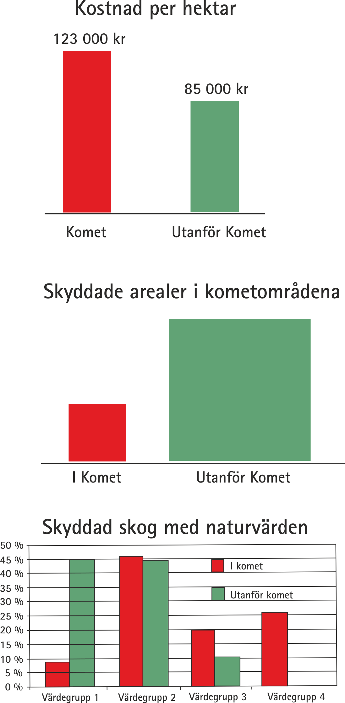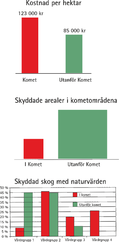 Diagrammen härintill visar en jämförelse mellan Kometprogrammet och det tidigare myndighetsstyrda sättet i försökslänen. Komet har hittills visat sig vara både dyrare och långsammare och skyddar inte i samma omfattning skog som har högst skyddsvärden.