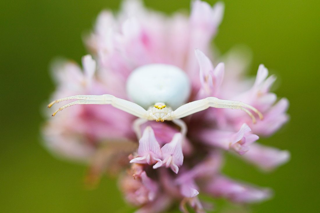 En blomkrabbspindel på en rödklöver på ängarna i Hågeryds naturreservat i Småland, midsommarafton 2024. ”Jag antar att den satt och väntade på ett byte, så det var skönt att jag inte var en fluga just då”, säger Nannie Persson.