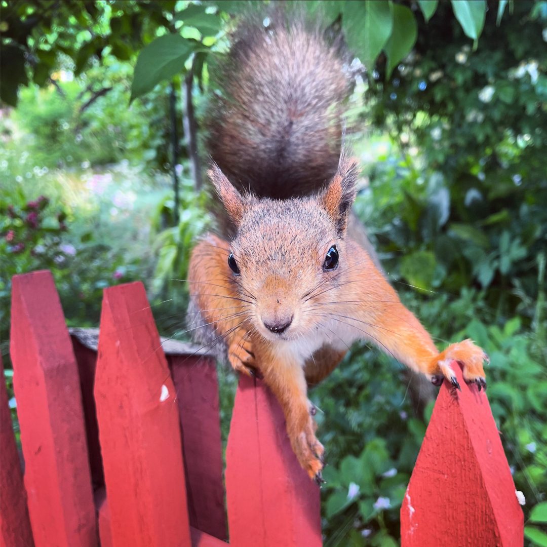 Under en promenad genom Eriksdals koloniområde, i Stockholm, den 9 juni 2024 dök plötsligt denna lilla ekorre upp. Helt orädd. Tyvärr har jag inte sett den igen, men jag hoppas den kommer tillbaka, säger Elisabet Modée.