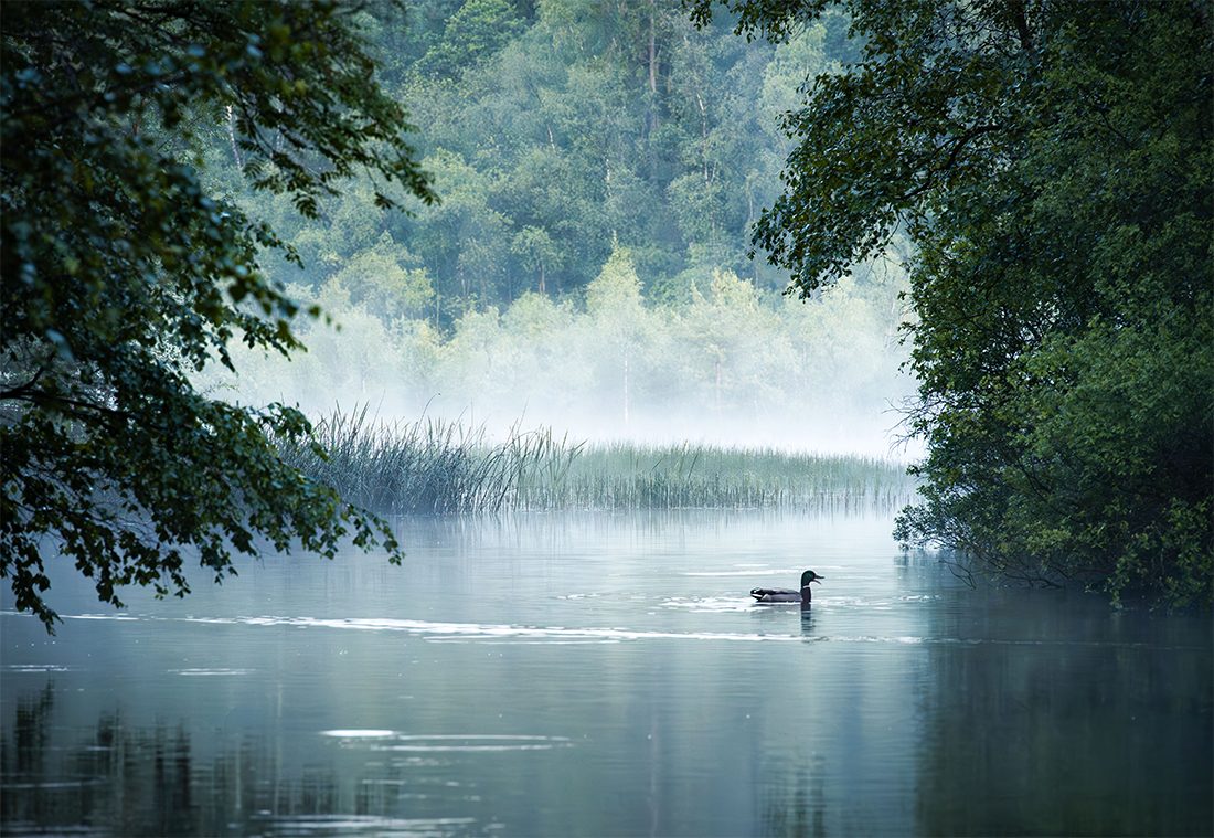 En kvällspromenad kring Delsjön i Göteborg på nationaldagen 2024. En gräsand på glid strax efter solnedgången med dimman som svepte in och gav en trolsk stämning i bakgrunden.