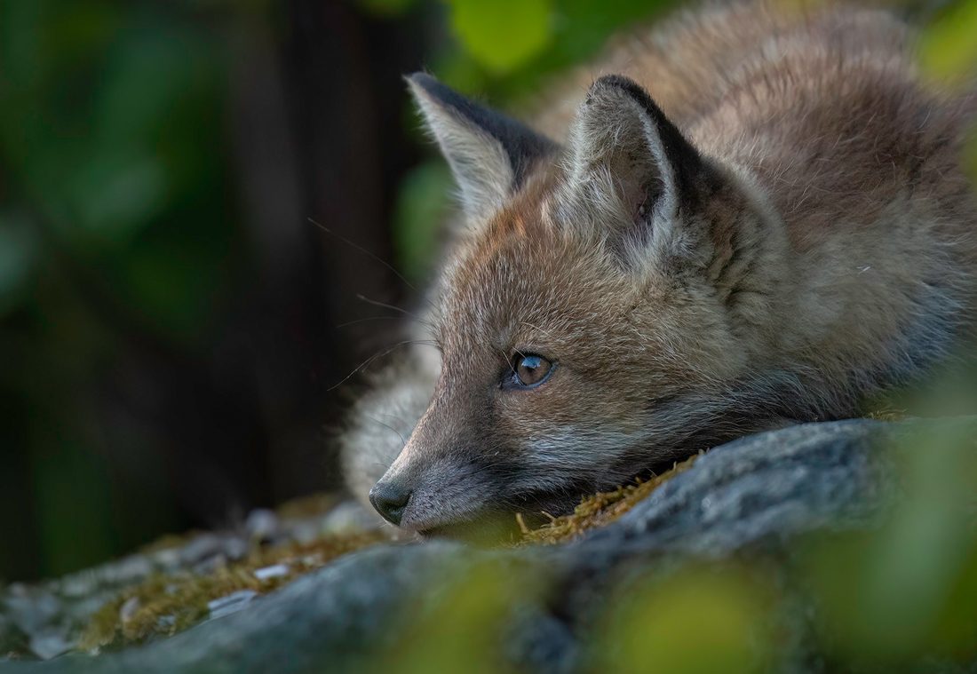 En vilande rävunge i Stockholm, i juni 2024. ”Denna lilla rävunge med sin genomträngande blick och sitt milda uppträdande förkroppsligar lugnet och skönheten i naturens stillhet”, säger Fatima Holmgren.