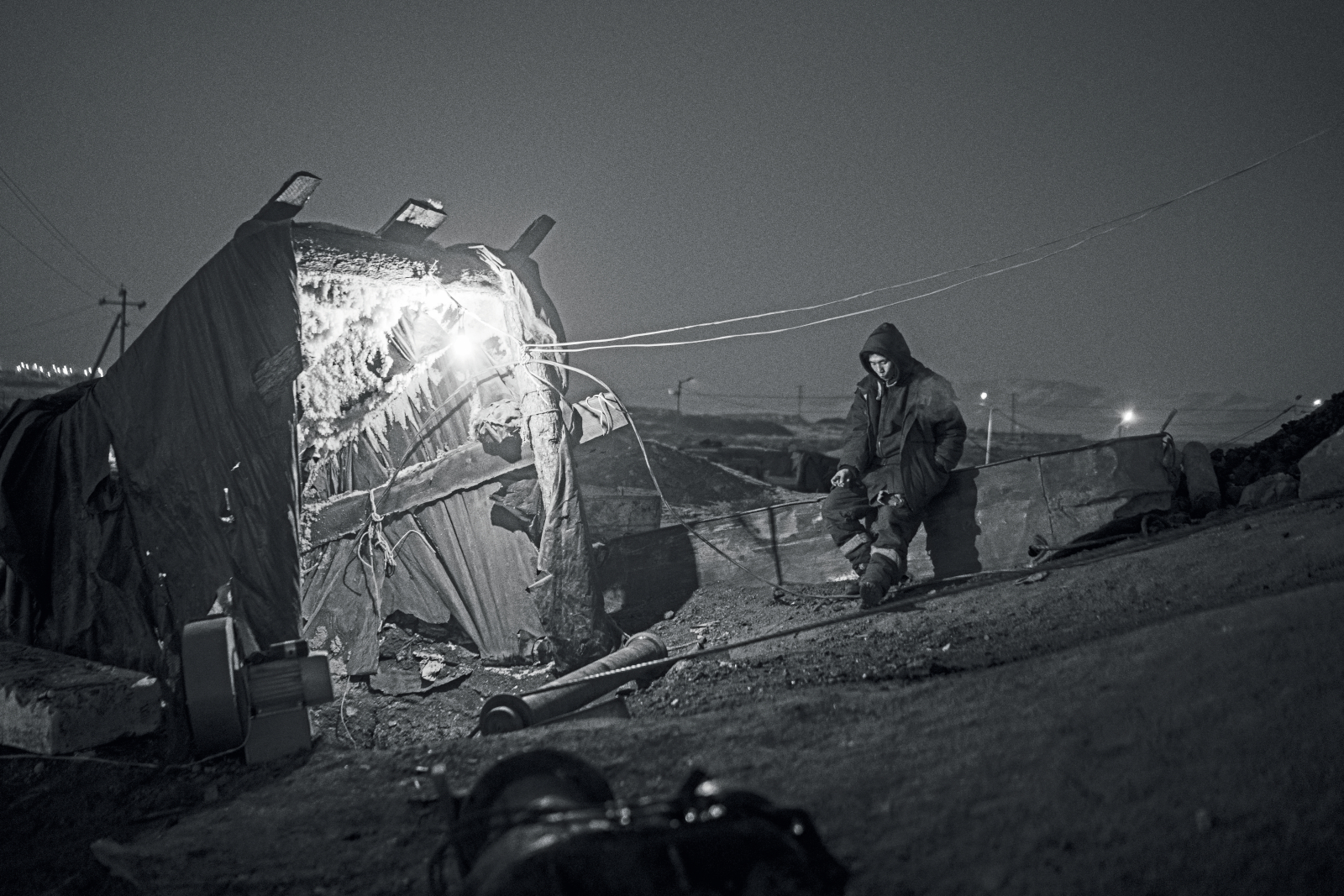 En gruvarbetare väntar på att ett lass med kol ska komma upp i en gruvöppning vid en illegal gruva i staden Nalaich.