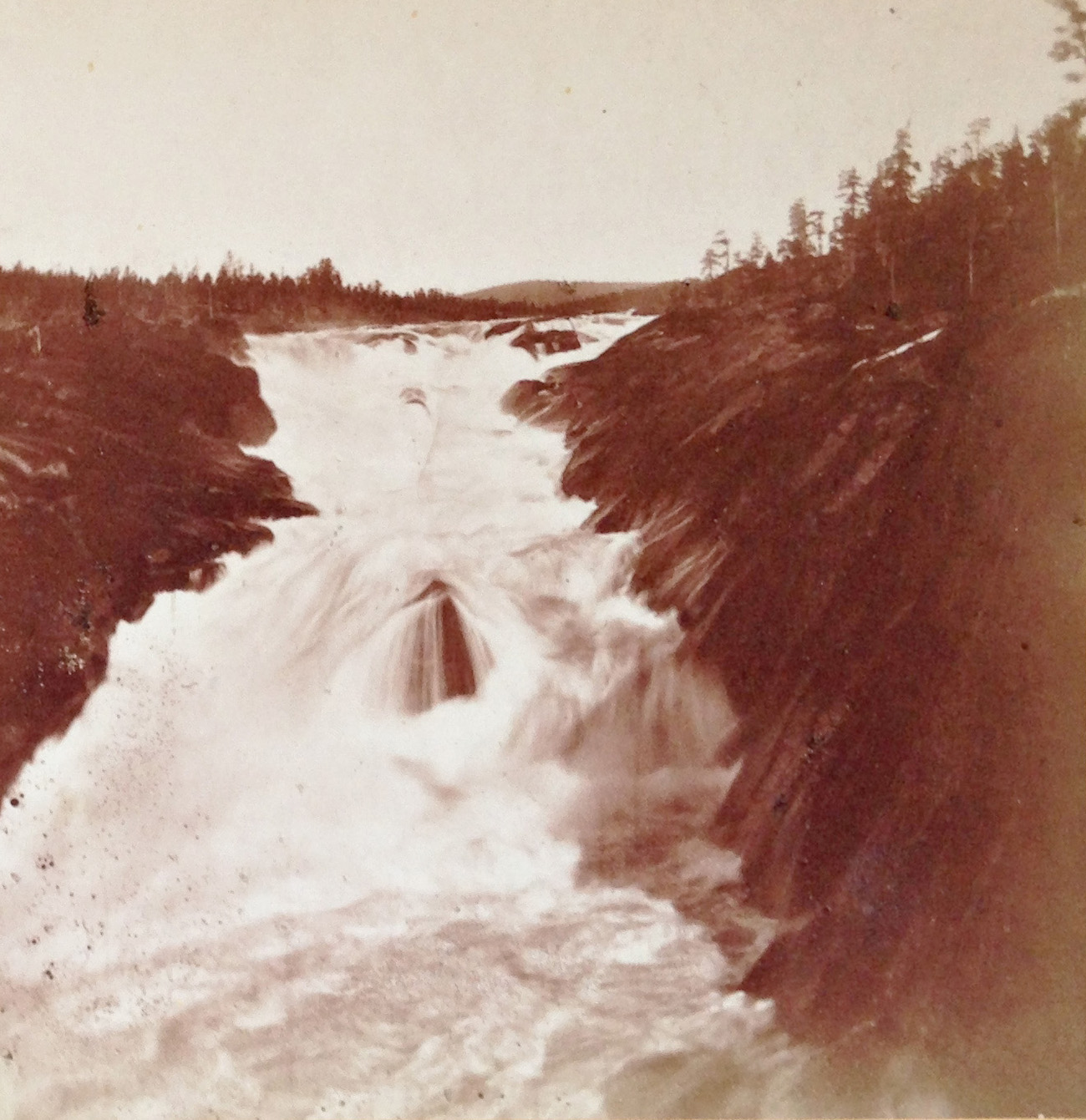 Harsprånget, Njommelsaska, samma vy som bilden av torrfåran ovan, fast från 1868. Fallet fick namn efter vattnets snabba svängar som liknade en hares flykt. Foto: Lotten von Düben, Nordiska museet.