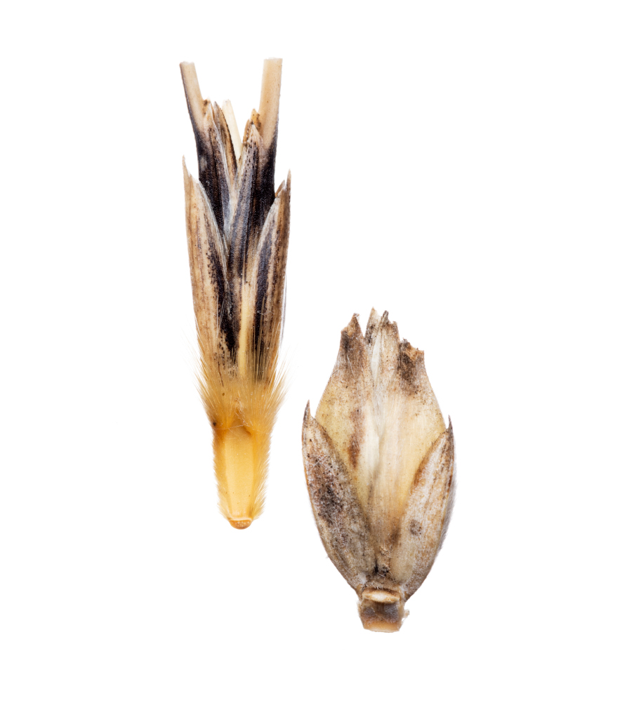 Hos vildemmer (till vänster) släpper fröet och ramlar rakt ner när det är moget. I modernt emmervete (till höger) sitter fröet kvar tills det rivs av eller tröskas. Det är ett av många exempel på hur grödor har förädlats för att passa vår matproduktion.