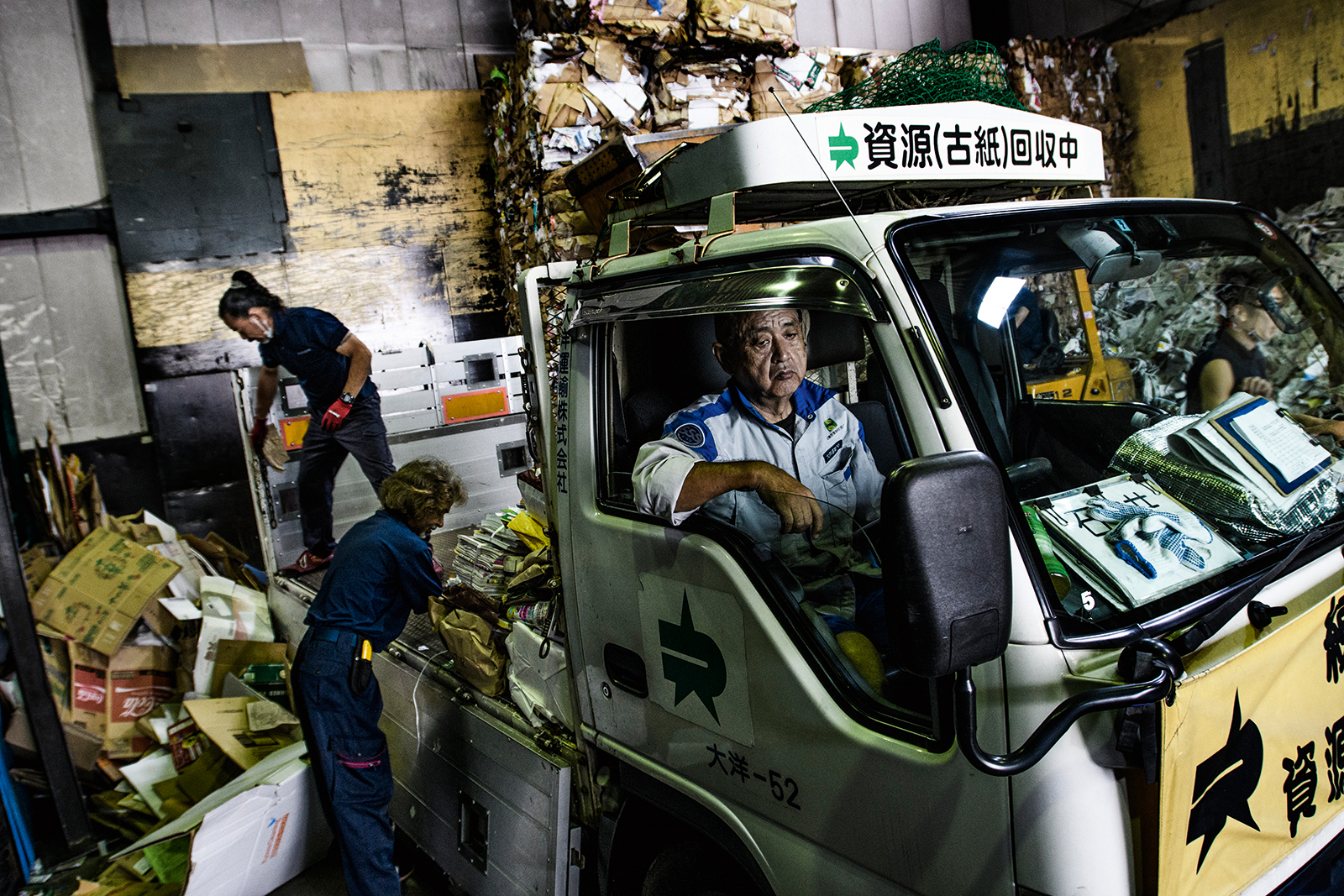 ÅTERVINNING Kartongskivor och gamla tidningar lastas av vid pappersåtervinningscentralen Shizai i Tokyo, Japan, där skräp har återvunnits sedan 1969.