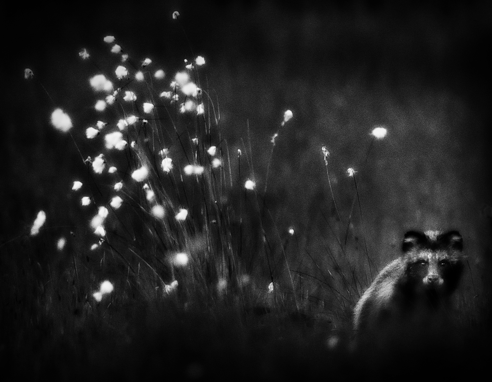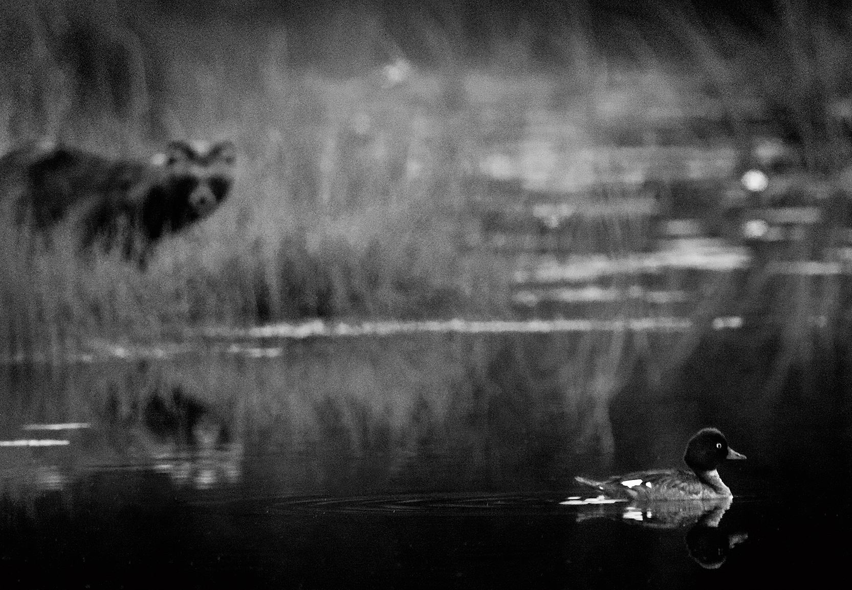 Mårdhund och knipa, södra Finland. ”Mårdhunden väcker känslor och ses som skadedjur, men jag ser den ur dess eget perspektiv. En överlevare och ett fascinerande litet rovdjur. Skyggt och smart.”