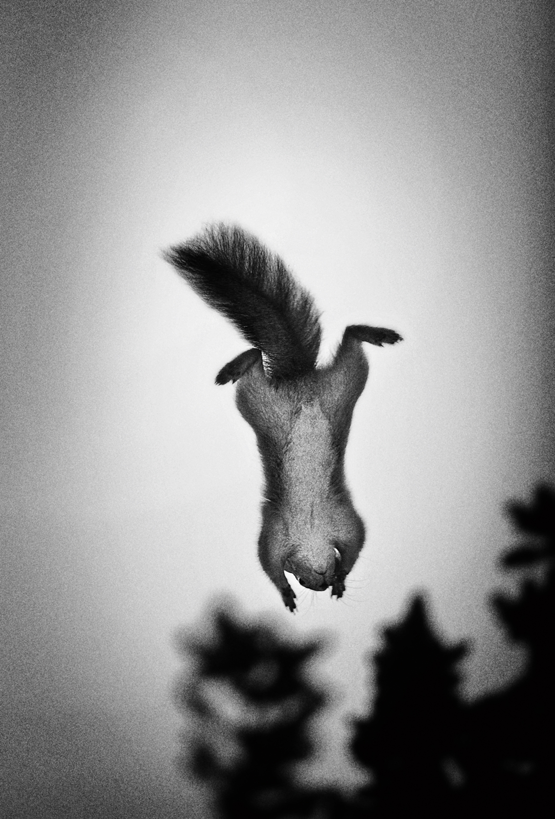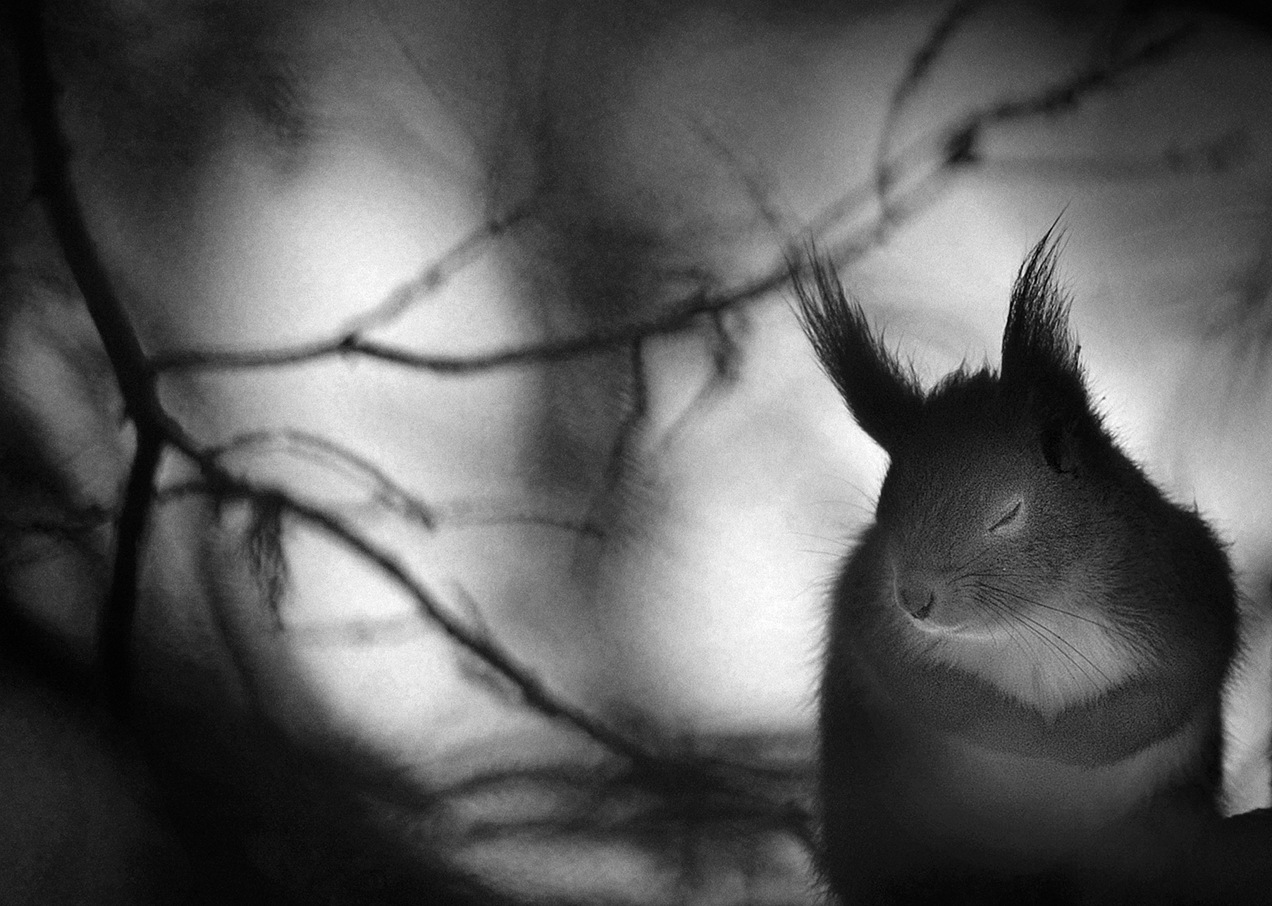 Ekorre, Småland. Bilden ”The Prayer (Winter Pause)” fick silverplatsen i BBC Wildlife Photographer of the Year 2017. ”Den är fotad ungefär 50 meter från platsen där jag fotograferade sparvugglan!”