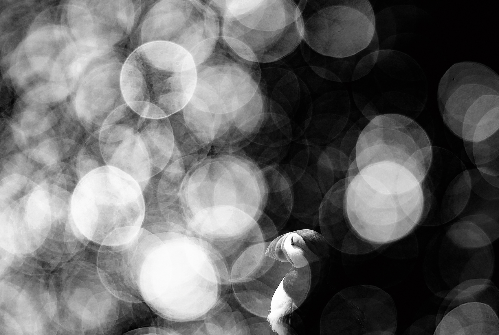 Lunnefågel, Shetland. ”En dubbelexponering – i andra bilden vred jag om kameran och zoomade in på vågor och vattenglitter.”