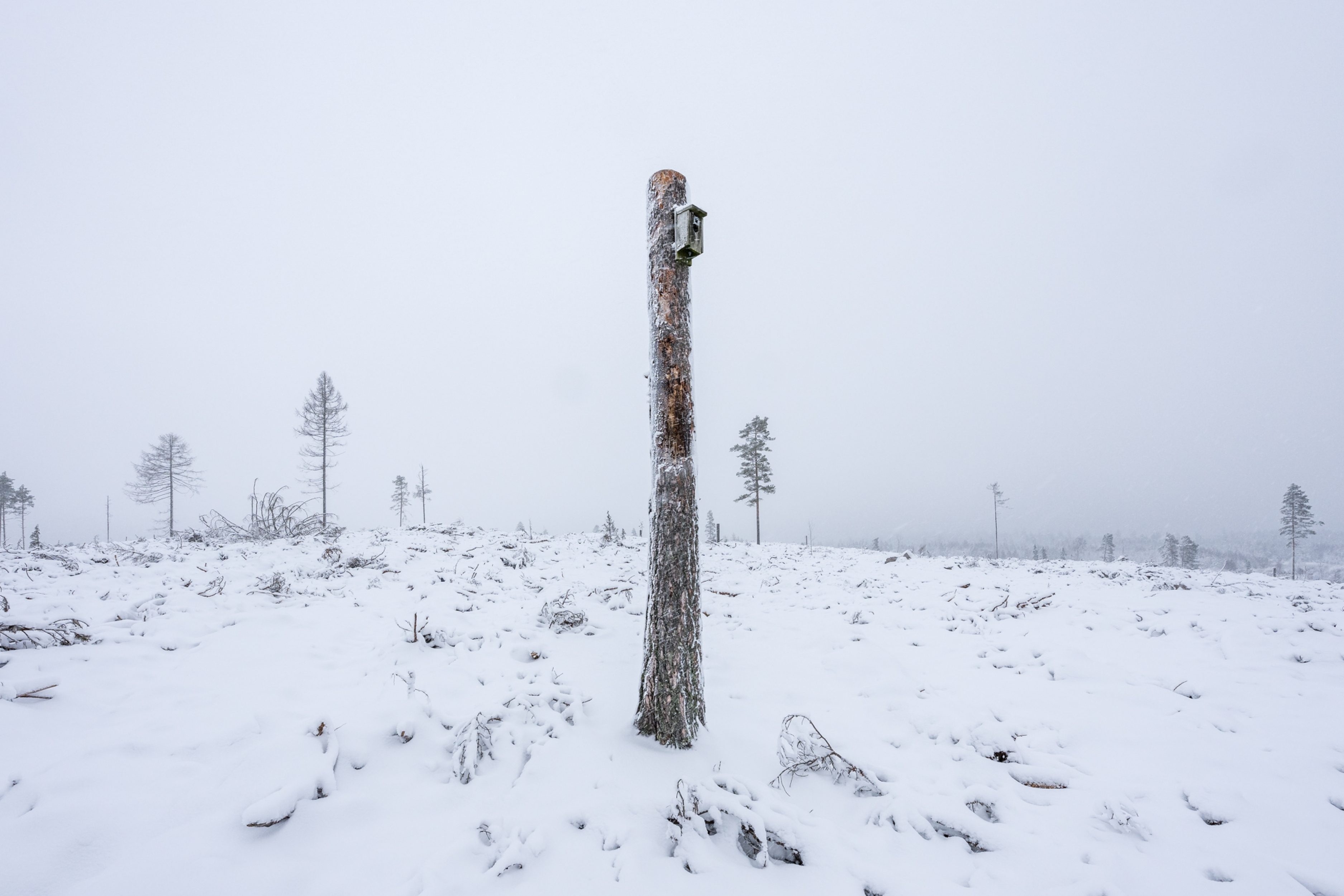En vanlig syn på kalhyggen är ensamma träd som lämnats kvar av “naturhänsyn”, vilket kan handla om till exempel artskydd.