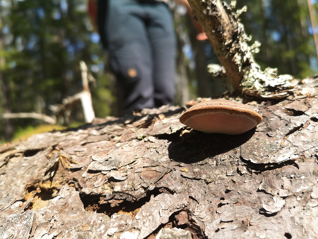 Det är lite obekvämt att hasa på knä och spana under fallna granar, men snart kommer belöningen. En brun svamp smetar som en chokladkaka på den grova barken: ullticka, indikator på höga naturvärden.