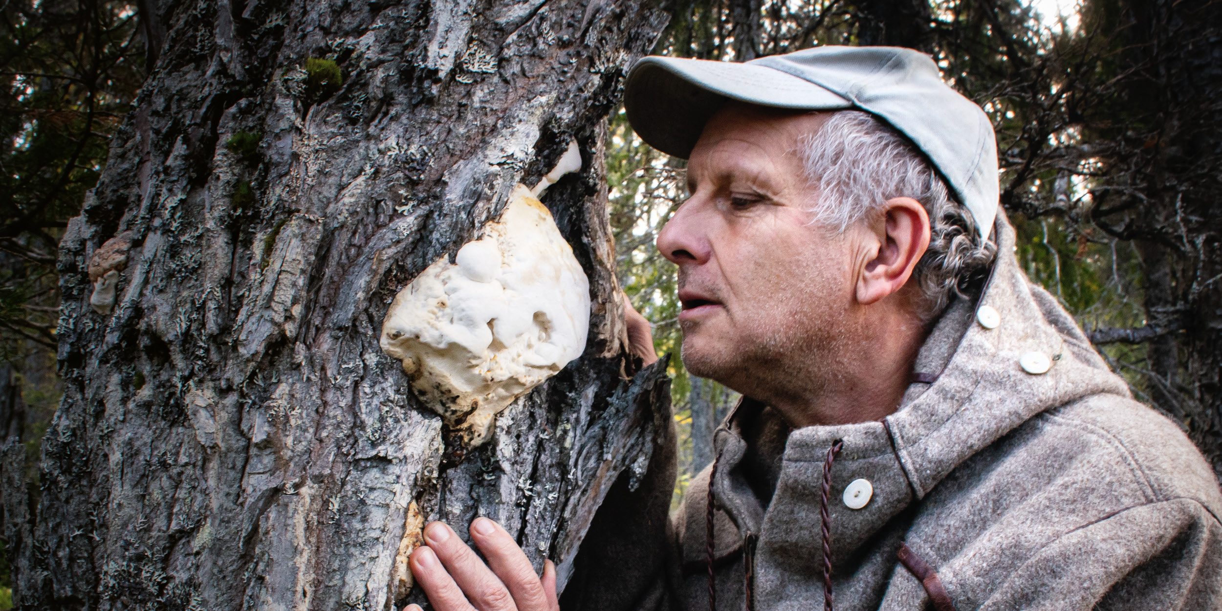 På en skrovlig stam växer den rödlistade lilla svampen gammelgransskål som visar på lång trädkontinuitet. Mats har själv gett den dess svenska namn.