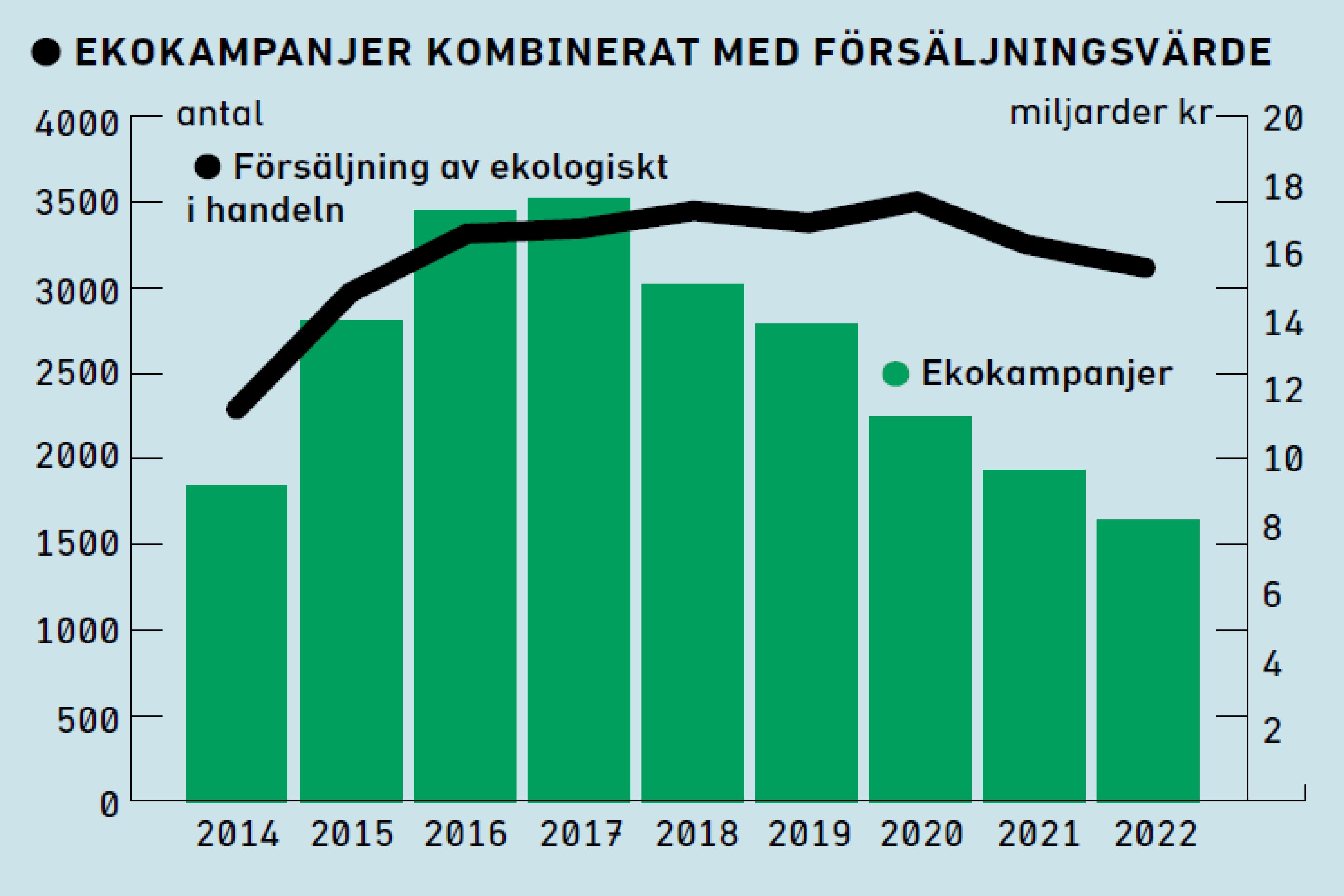 Källor: ”Vart tog ekokampanjerna vägen? En granskning om kopplingen mellan kampanjer och försäljning av ekologiskt” (Sveriges konsumenter, 2023) och Ekologiska årsrapporten 2022 (Organic Sweden, Ekologiska lantbrukarna m fl).