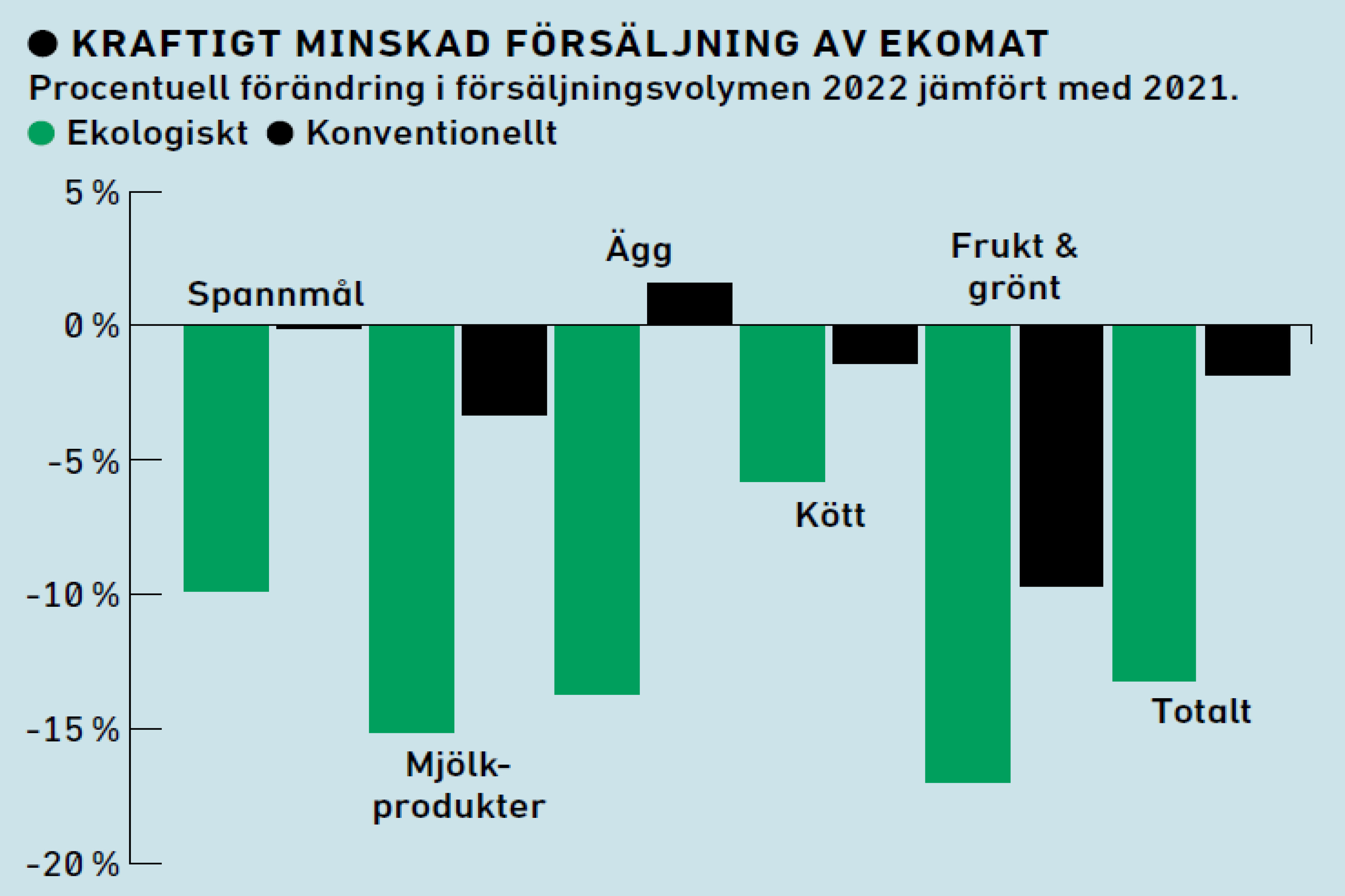 Enligt Ekologiska årsrapporten 2022 har volymen ekologiska livsmedel minskat kraftigt i dagligvaruhandeln. Lägre försäljningsvolym för ekologiska produkter och låga merpriser (prisskillnad jämfört med konventionellt) leder till mindre ekologisk odling, under 2022 minskade den ekologiskt brukade arealen i Sverige med tre procent.