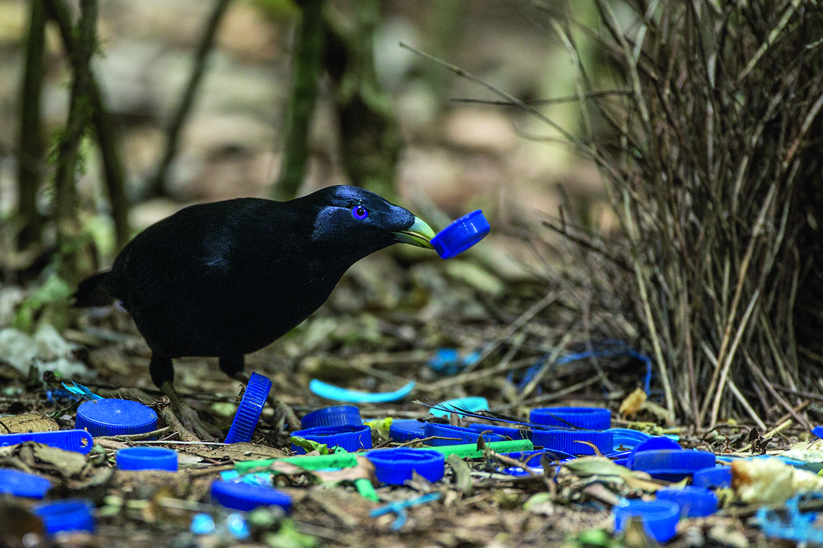 Plasten finns överallt: glanslövsalsfågeln smyckar spelplatsen i regnskogen med turisters skruvkorkar. Foto: Henrik Ekman.