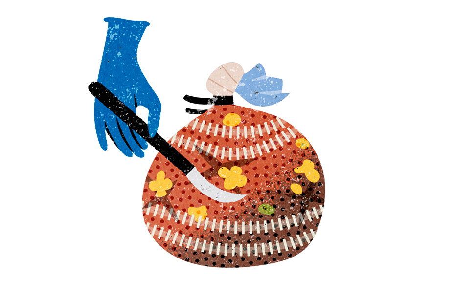 Häll ner sågspån, 50 gram träpellets och 100 gram mycel i en svamppåse. Om påsen känns för stor kan du knyta ihop undersidan för att korta den, men se till att filterranden inte försvinner. Häll på vattnet och blanda runt i påsen, förslut med en plastklämma och låt stå i 25 minuter. Kläm ihop påsen försiktigt och packa innehållet lite tätare så att du får en ”kloss”, men behåll filtret synligt. Då hålls mögel borta men syre och frisk luft kommer in. Vik ner överdelen och förslut med tejp.