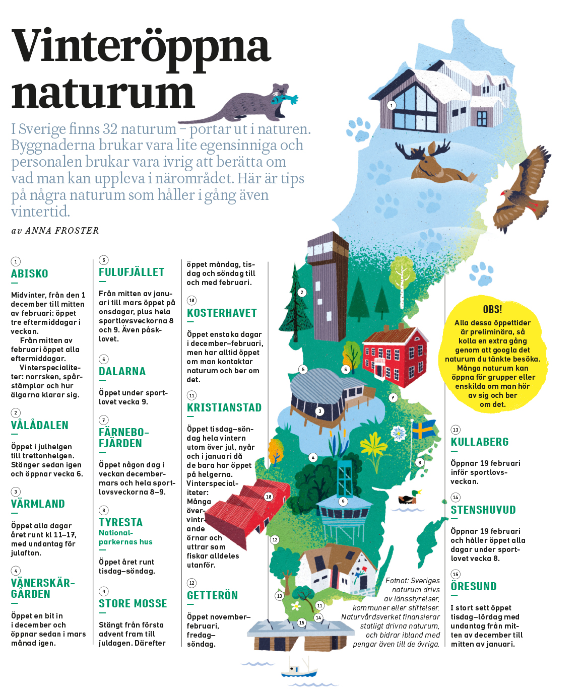 I Sverige finns 32 naturum − portar ut i naturen. Byggnaderna brukar vara lite egensinniga och personalen brukar vara ivrig att berätta om vad man kan uppleva i närområdet. Här är tips på några naturum som håller i gång även vintertid.