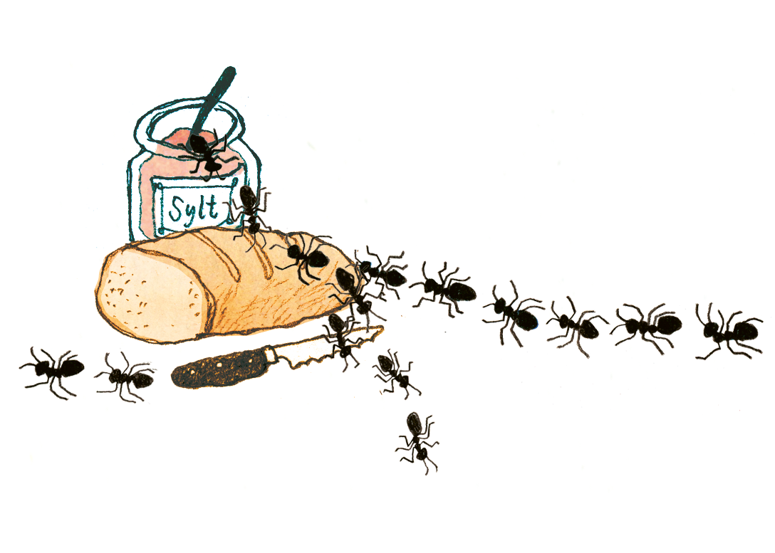 När myran hittat något gott lämnar den ett doftspår på väg hem till boet. Så kan andra myror följa spåret för att hitta fram till maten. Om du inte vill ha myrbesök är det bäst att stänga burkar och kärl och se till att inget gott står framme.