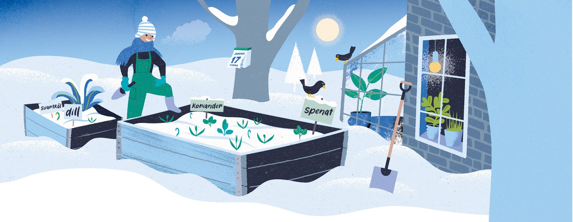 Vill man ge sig på året runt-odling föreslår Farbror Grön att man börjar med att så ett par påsar spenatfrön i en pallkrage eller liknande yta på friland mellan januari och