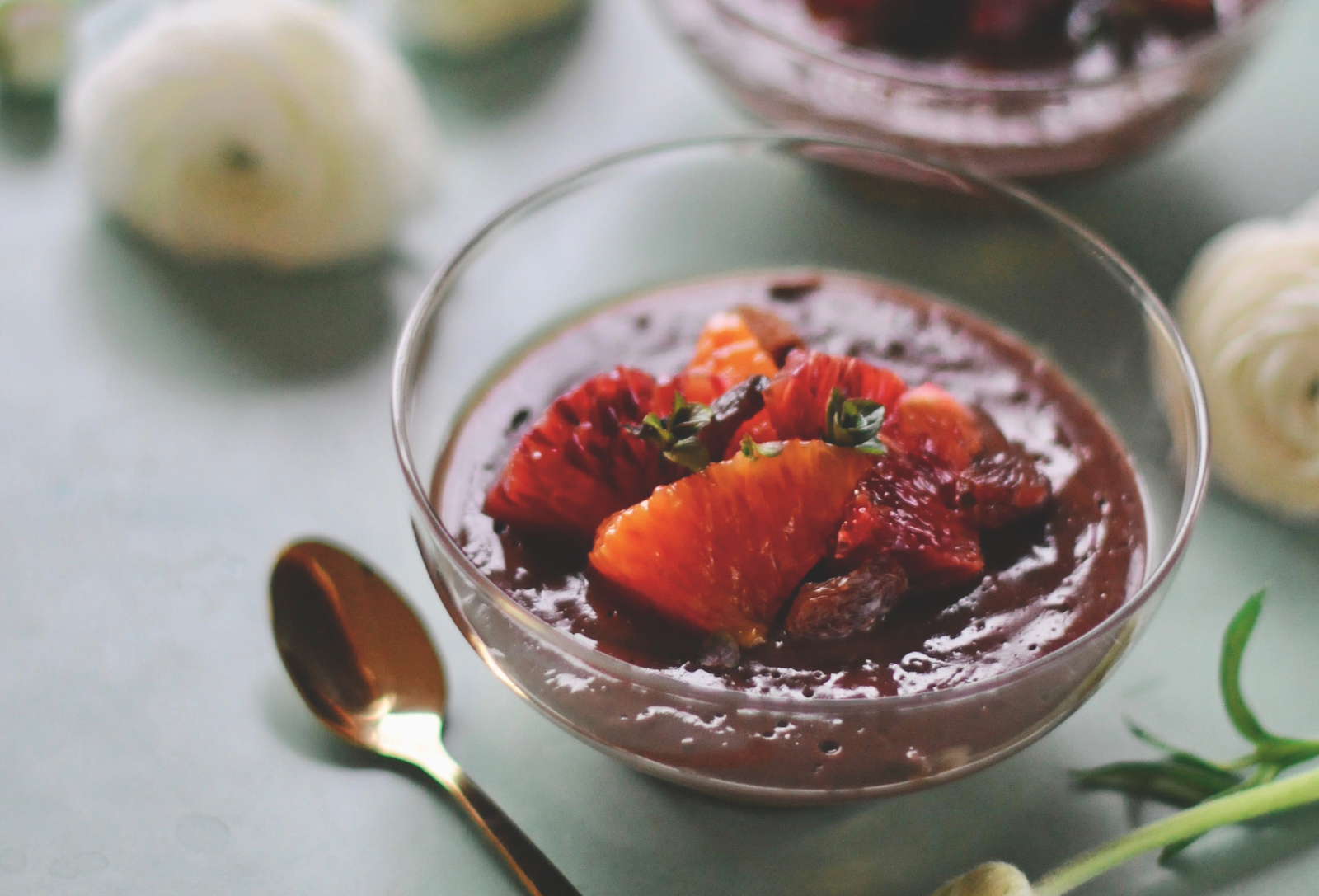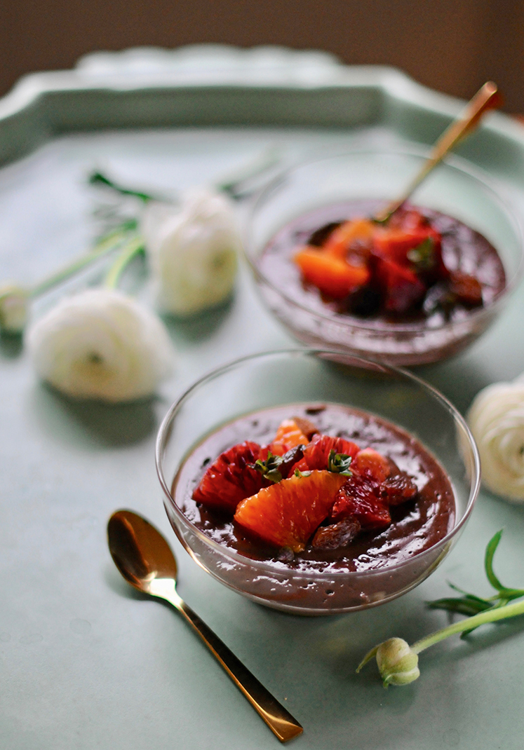 En fånigt god, klassisk dessert som passar bra efter en lite lättare grönsaksmåltid. Men den måste lagas dagen innan den ska ätas. Välj ekologiskt så långt det går. Vispa samman 6 dl fet mjölk, ¾ dl majsstärkelse, 1 dl muscovadosocker, 1 tsk vaniljsocker/essens, ½ tsk nystött kardemumma och 1 dl kakao i en liten kastrull. Koka upp under omrörning tills krämen tjocknat ordentligt. Slå upp i fina små glasskålar eller koppar. Täck över och låt stå i kyl över natten. Lägg ½ dl russin att dra i ½ dl mörk rom över natten. Toppa chokladpuddingen med värmda romrussin och lite lösvispad grädde. Barnen får förstås russin utan rom.