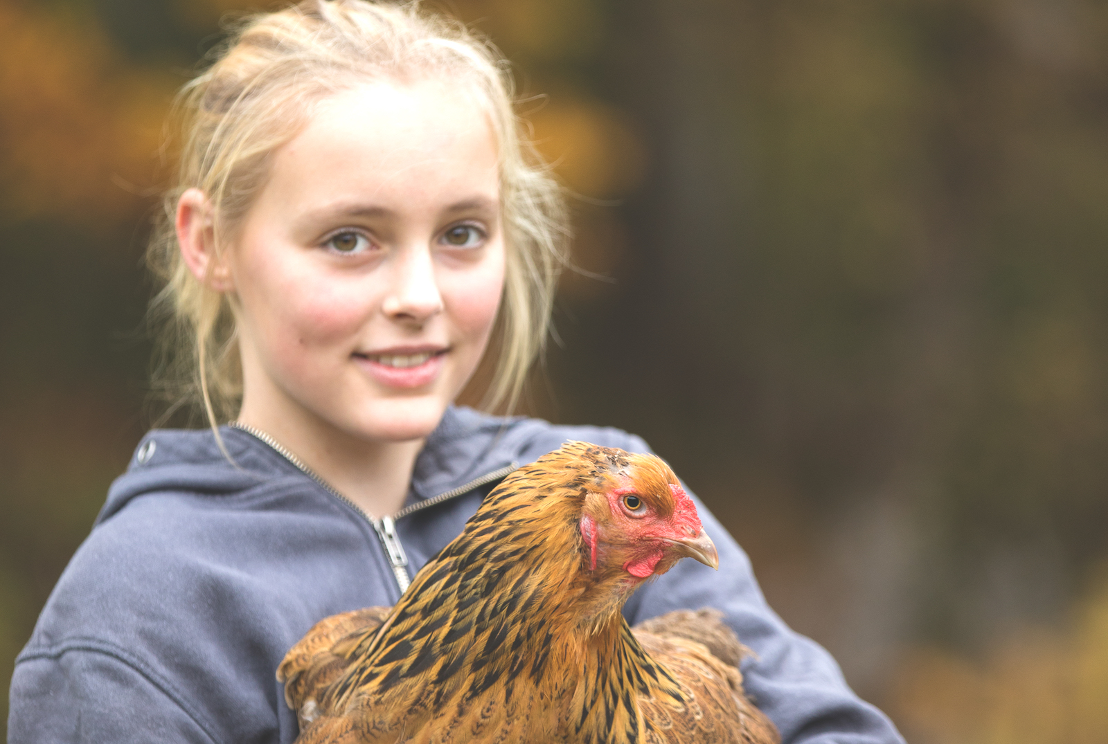 Julia och hönan med samma namn trivs ihop. FOTO: Kristoffer Sahlén