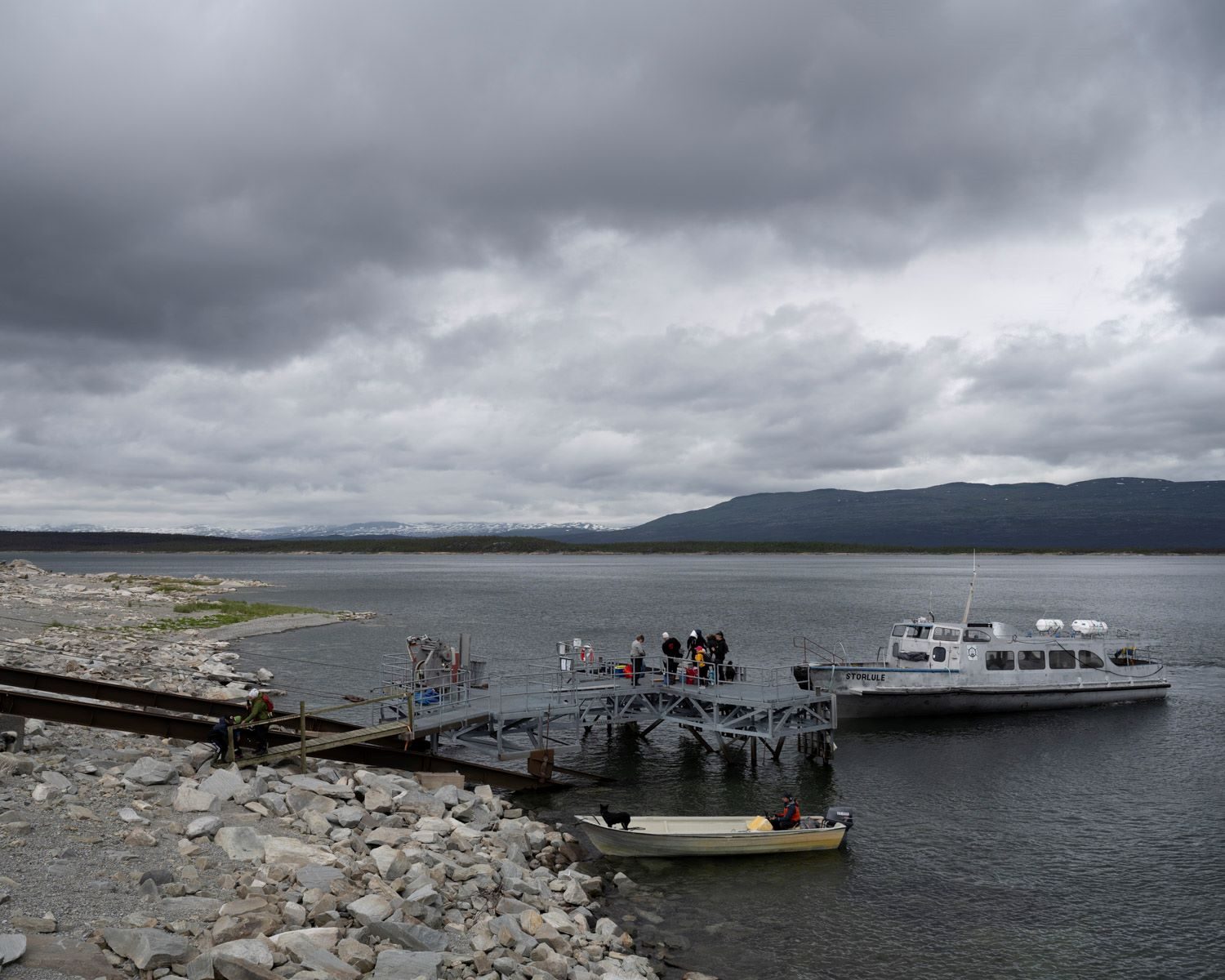 På andra sidan står vattnet lågt och en hög stenig strandzon breder ut sig. Stålbryggan vid STF-stugan går på räls, för att kunna höjas och sänkas.