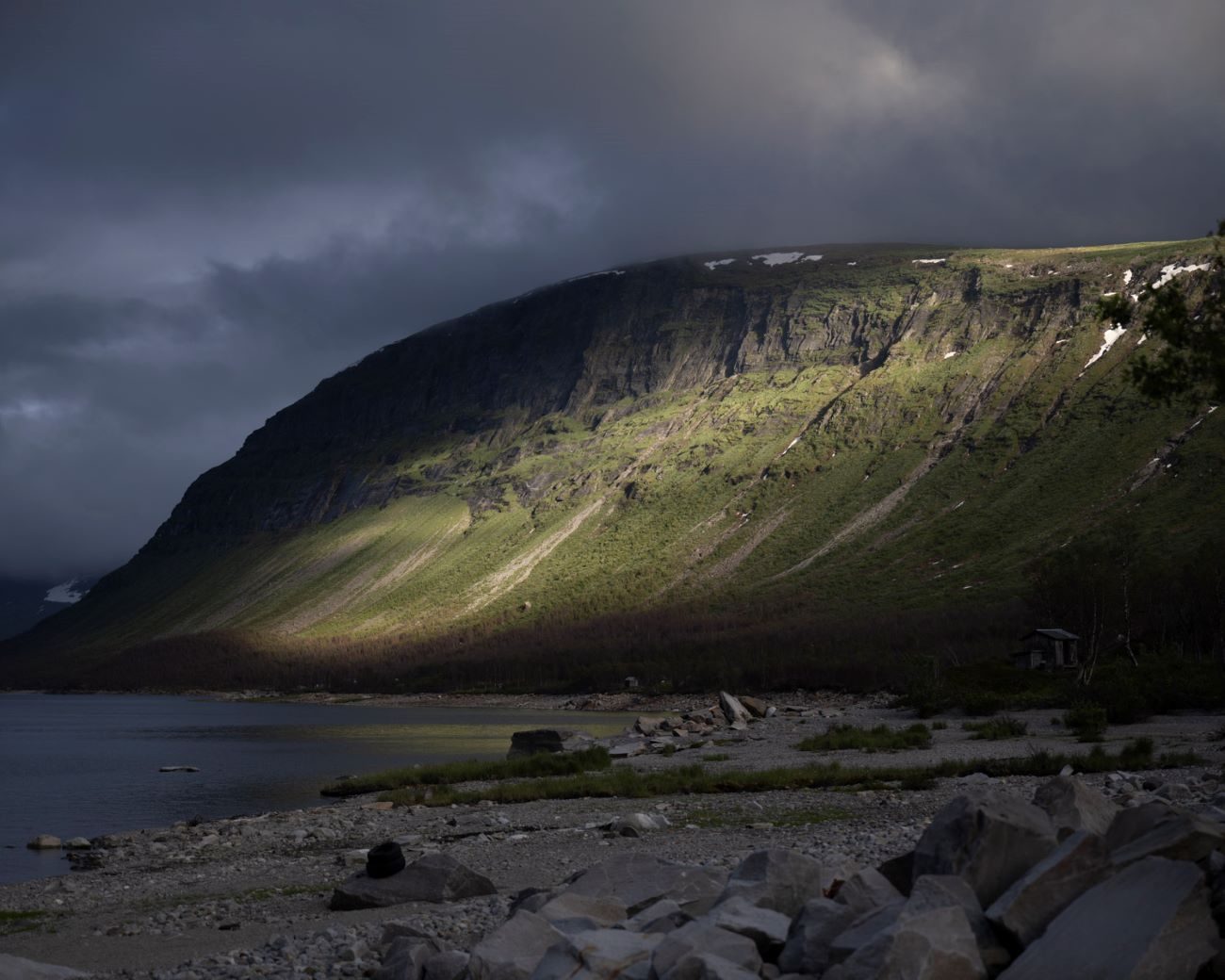 Just så är det också när vi kommer. Regnet piskar, stormen viner och alla båtturer är inställda. Men efter en natt på fjällstationen i Ritsem lyser solen och sjön speglar Áhkkámassivets snöklädda toppar.
