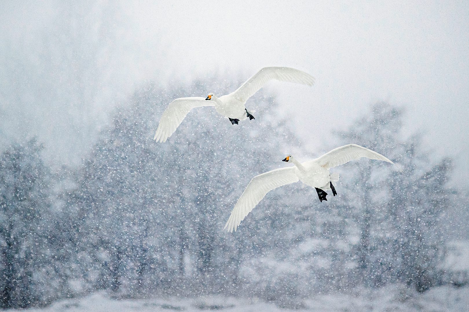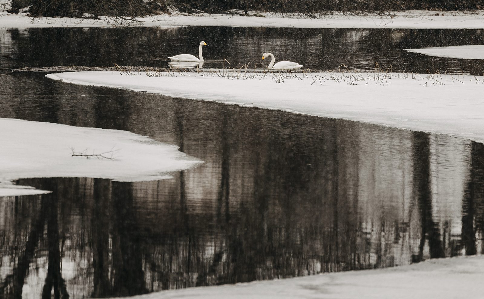 Vi fortsätter uppåt Kilsbergen medan snön faller tätare. Och jo då, svanparet är på plats, simmar lugnt i mörkt öppet vatten där isen brutits upp. Bara de gula näbbarna bryter det grafiskt svartvita.