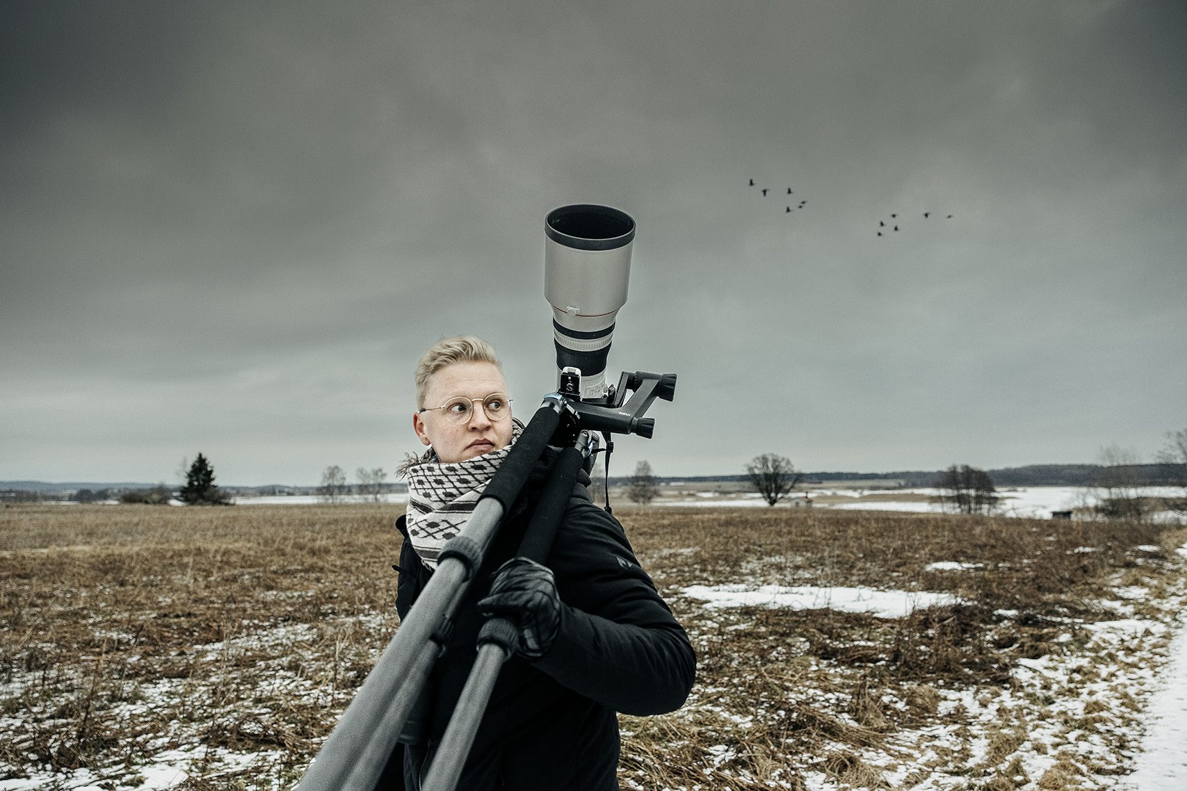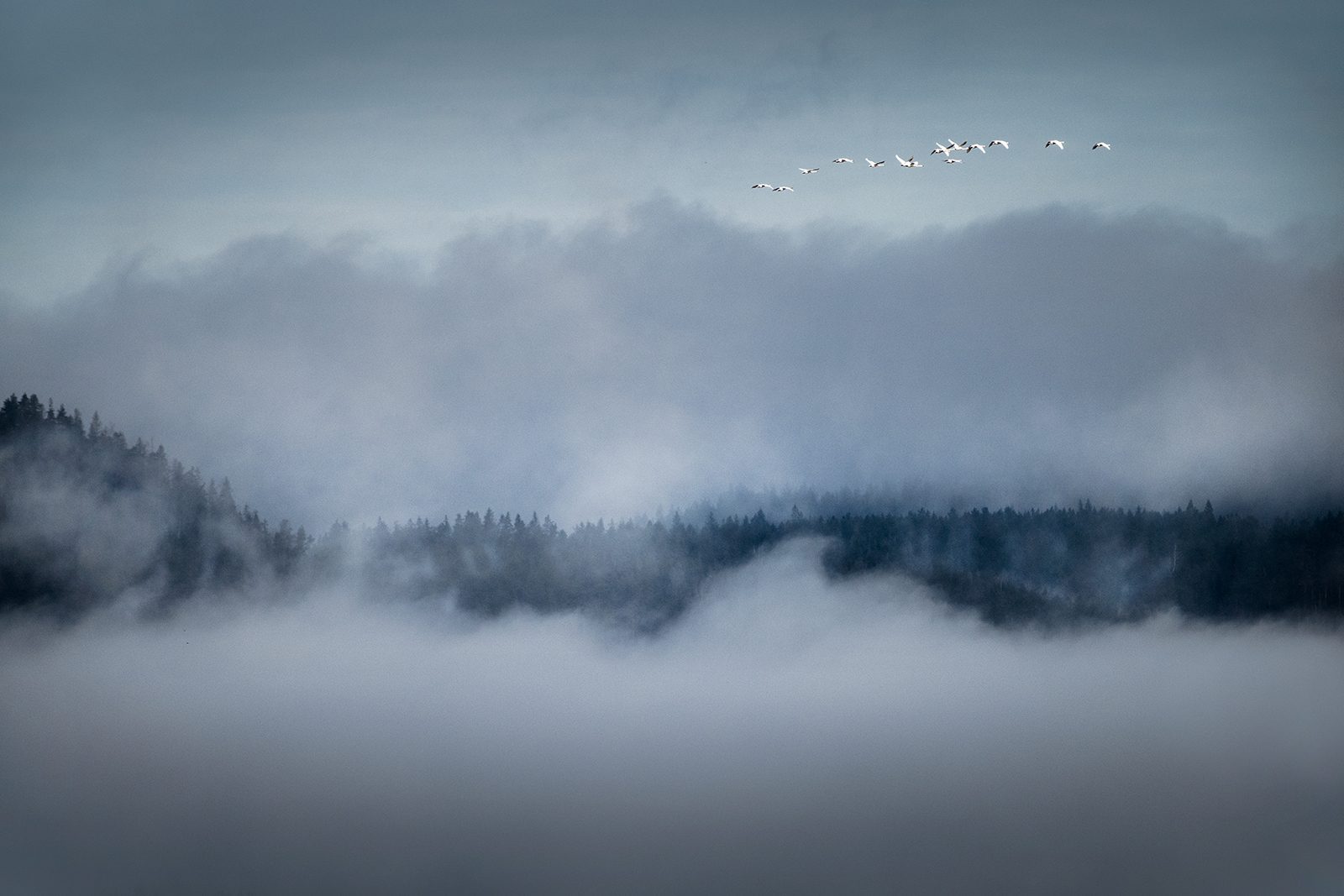Kameran står på ett stadigt stativ mellan vassruggarna. Jonas söker av skogsranden med kikaren och lyssnar intensivt. Ett avlägset trumpetande hörs, snart sveper fem bländvita silhuetter med långsträckta halsar in söderifrån.