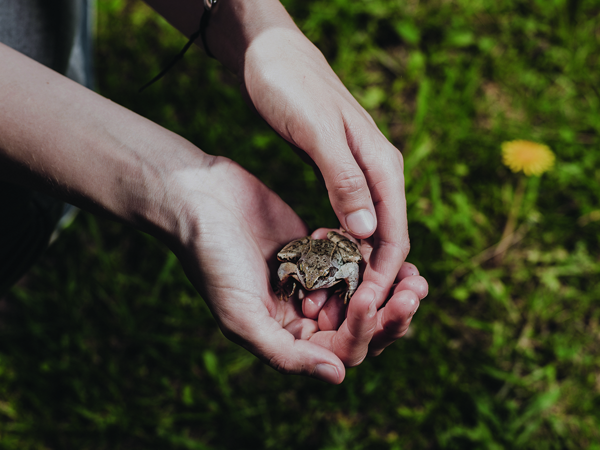 Vi vandrar under de höga träden och på spänger i Rosenkällasjön, som Rebecka var med om att restaurera (”jag dissekerade gäddmagar…”). En sothöna simmar nyfiket en bit bort, längre ut ett knölsvanpar. I ett sankt parti träffar vi en liten groda.